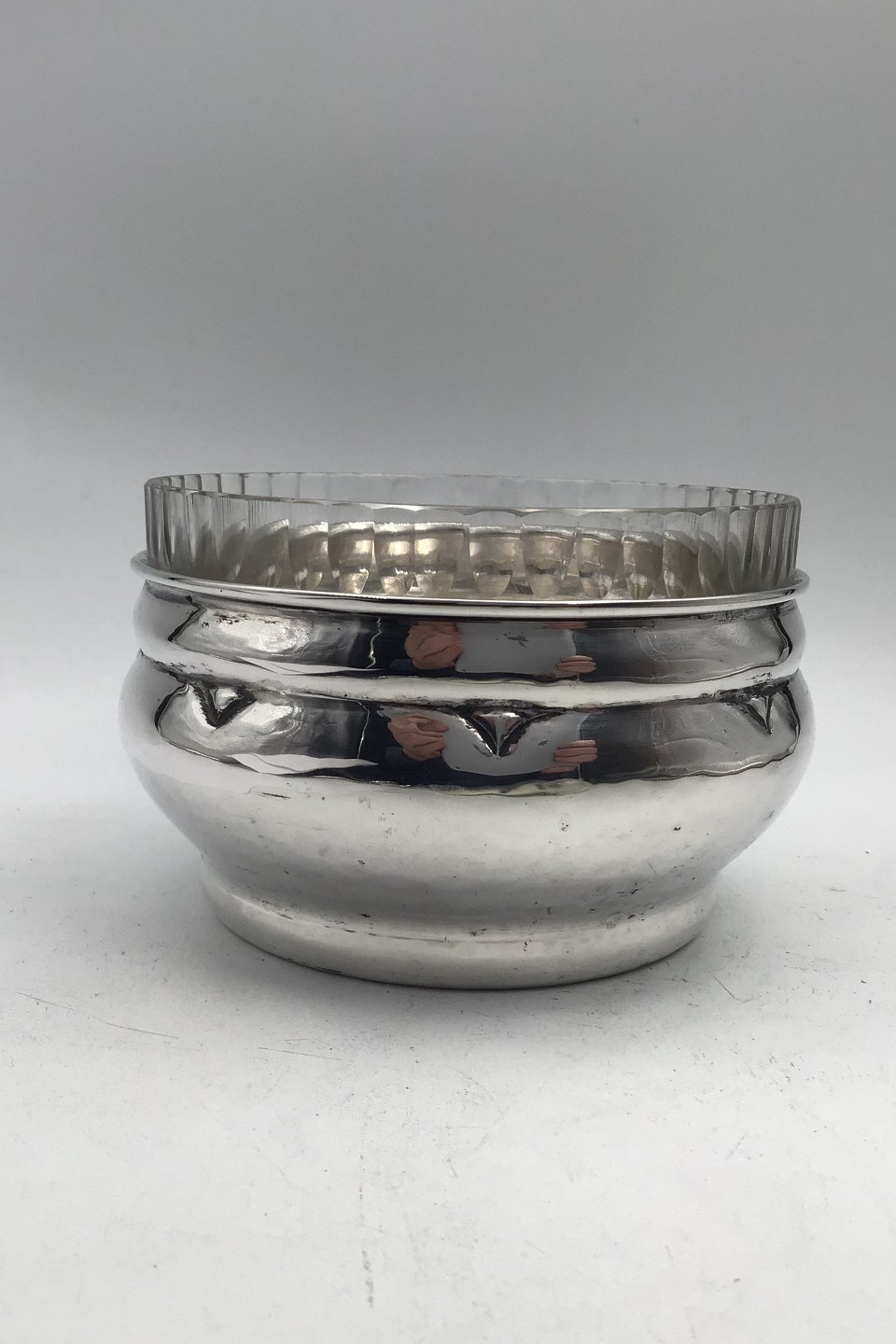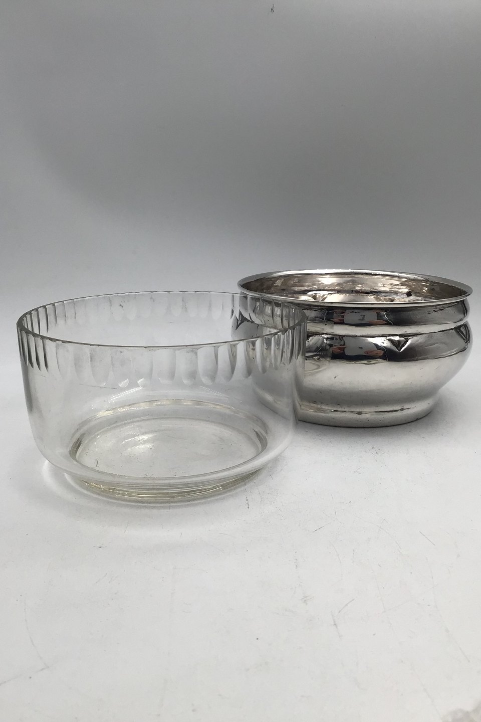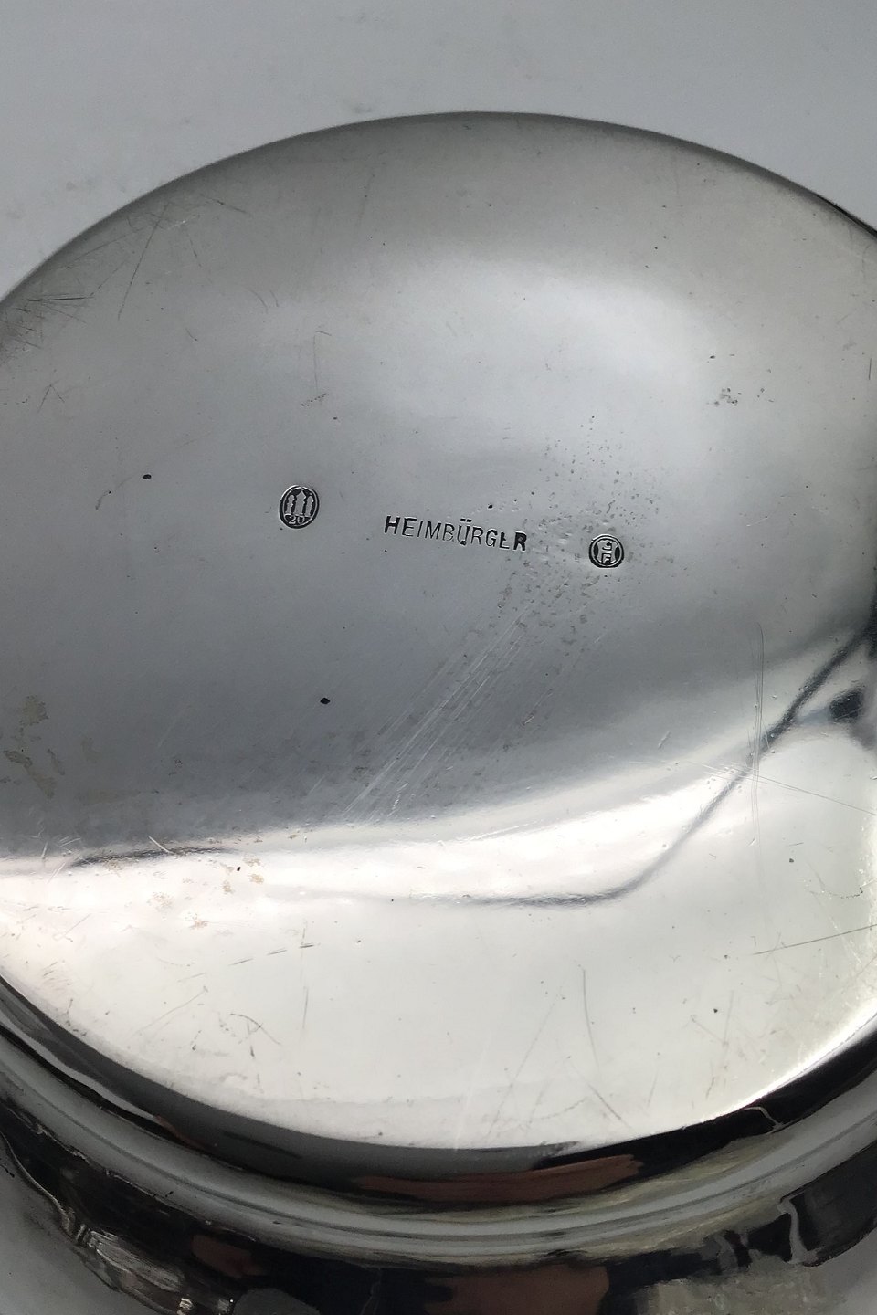 Heimbürger Sølvskål med glasindsats (1920) Måler Sølvskål H 7 cm (2.75 inch) Diam 13.5 cm (5.31 inch) Glasindsats 7 cm (2.75 inch) Diam 12 cm (4.72 inch) Samlet Vægt 407 gr (14.3 oz)
