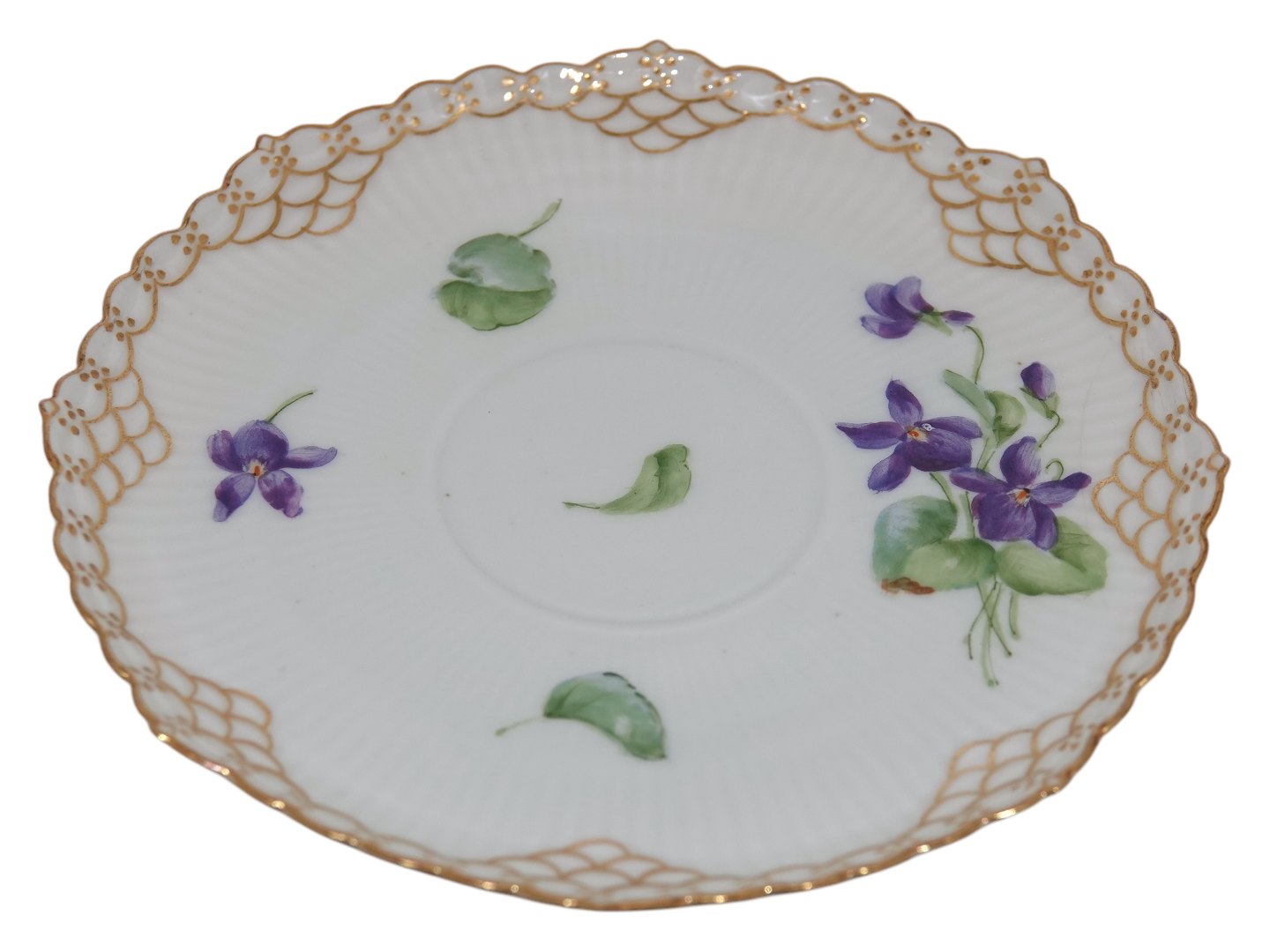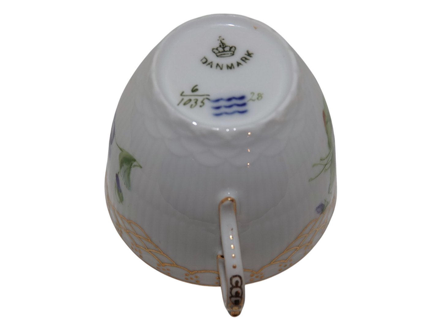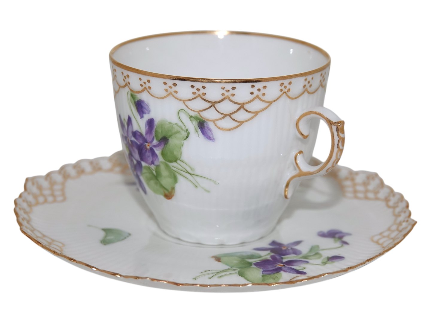 Royal Copenhagen Blå Violer Helblonde med guldkant, kaffekop med tilhørende underkop.