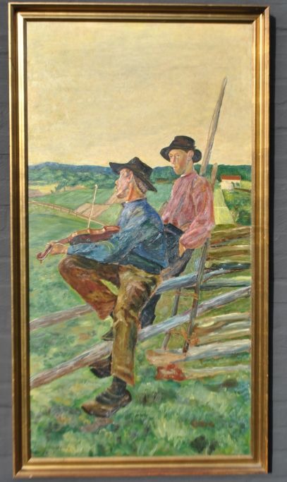 Ubekendt kunstner (20. årh. ): Bønder holder hvil, 1931. Olie på massonit. Signeret: A. Ravn 1931. H: 120 cm. B: 63 cm.