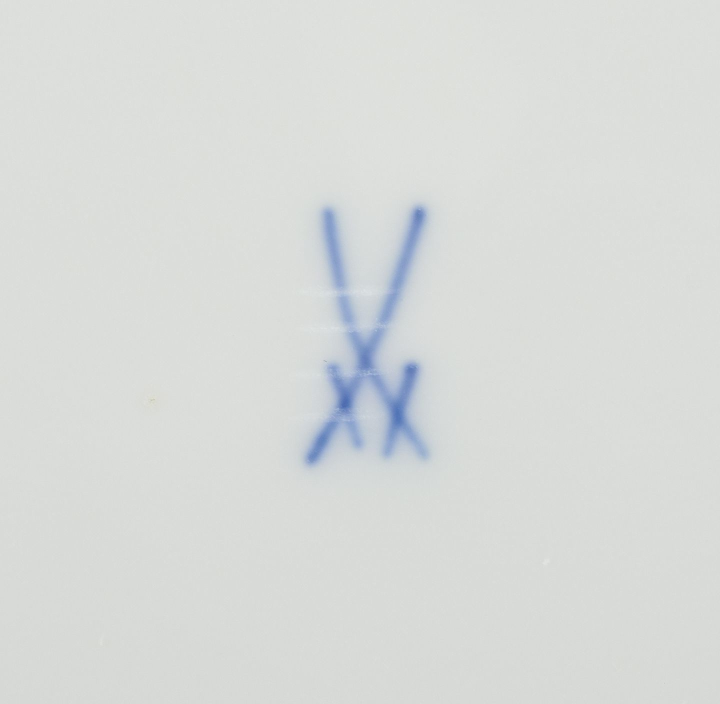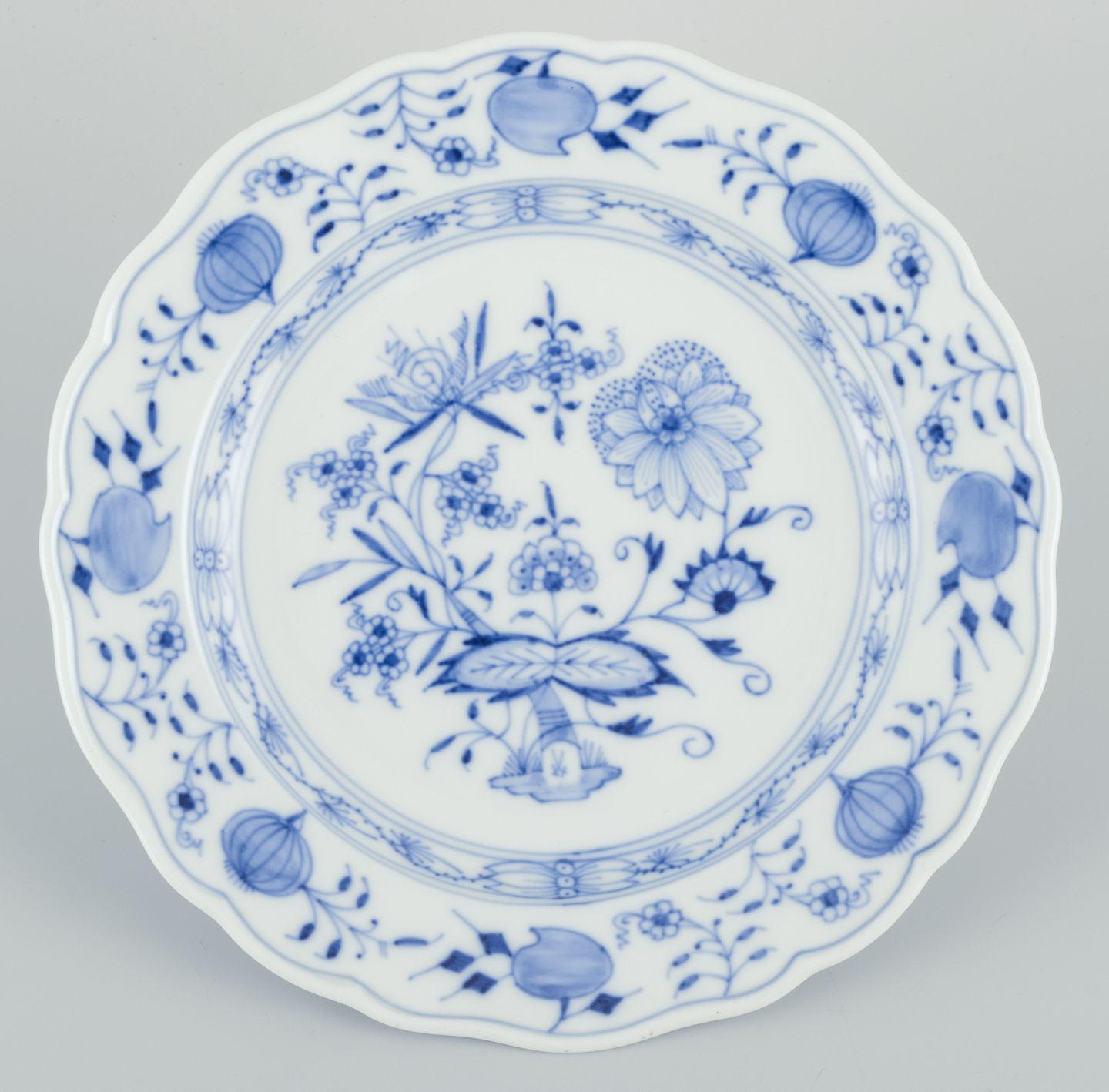 Meissen, tre løgmønstrede tallerkner i blåmalet porcelæn.