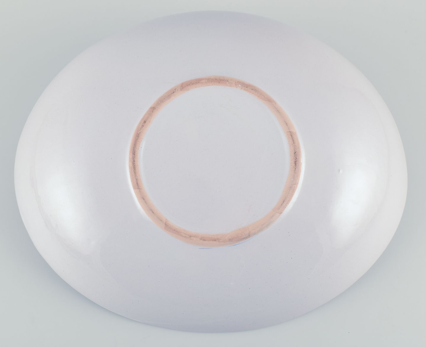 Stor oval keramikskål håndmalet i blåt. Motiv af gæster i hestevogn på vej til fest på slottet.