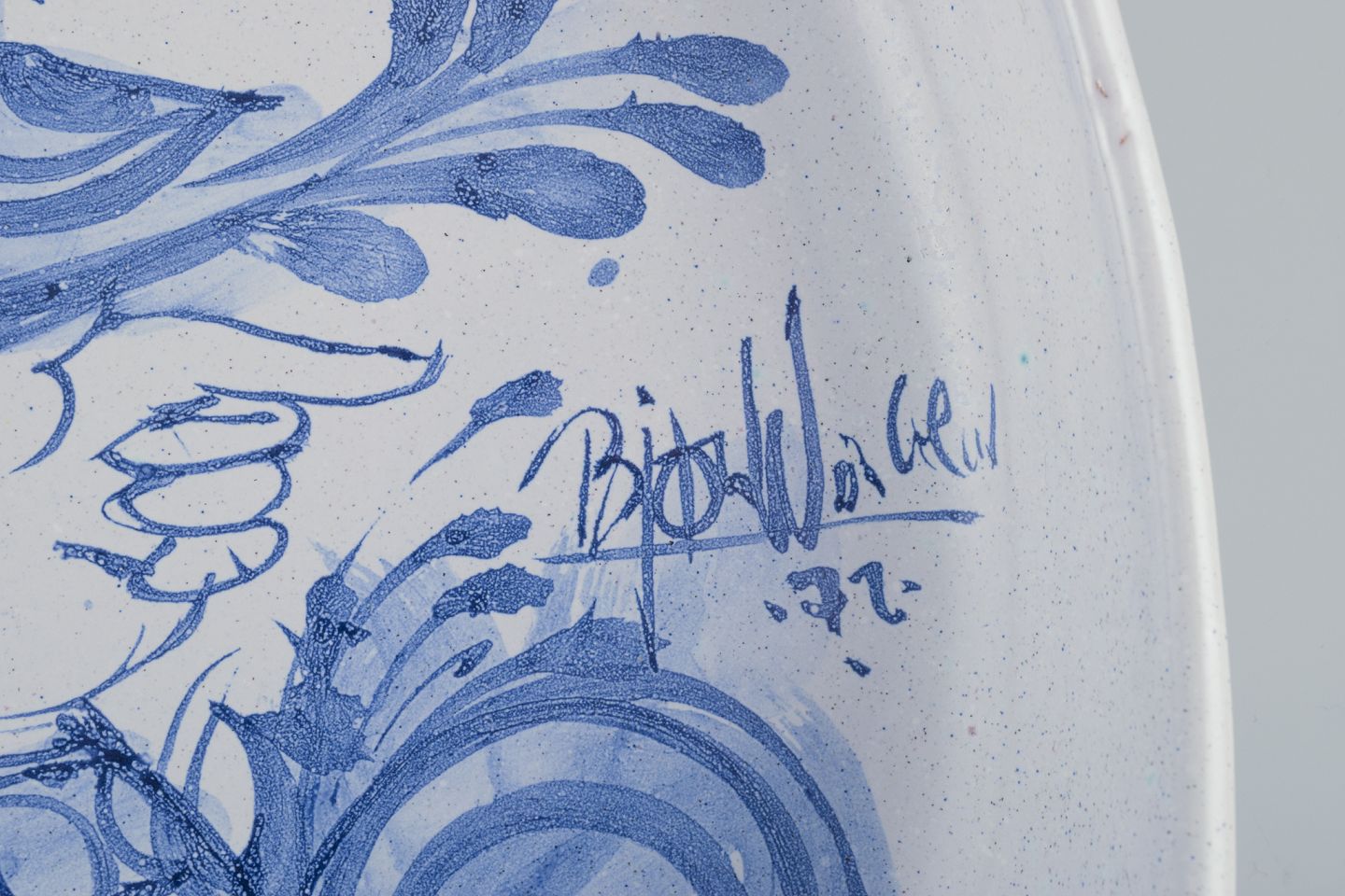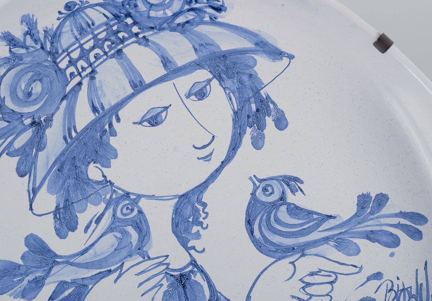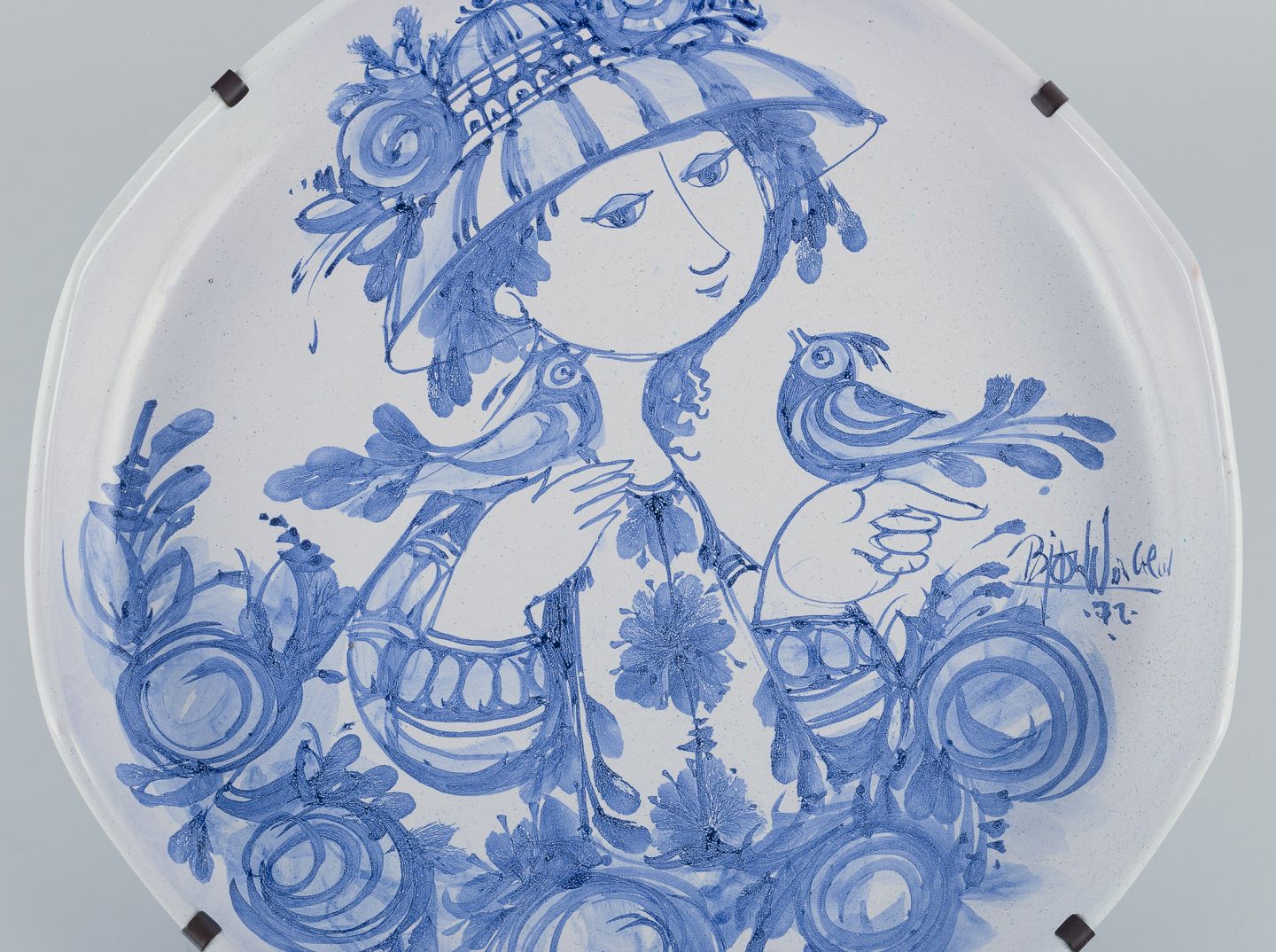 Bjørn Wiinblad (1918-2006), Det Blå Hus, eget værksted. Stor skål i keramik med oktagonal form. Håndmalet i blåt. Motiv af kvinde og fugl.