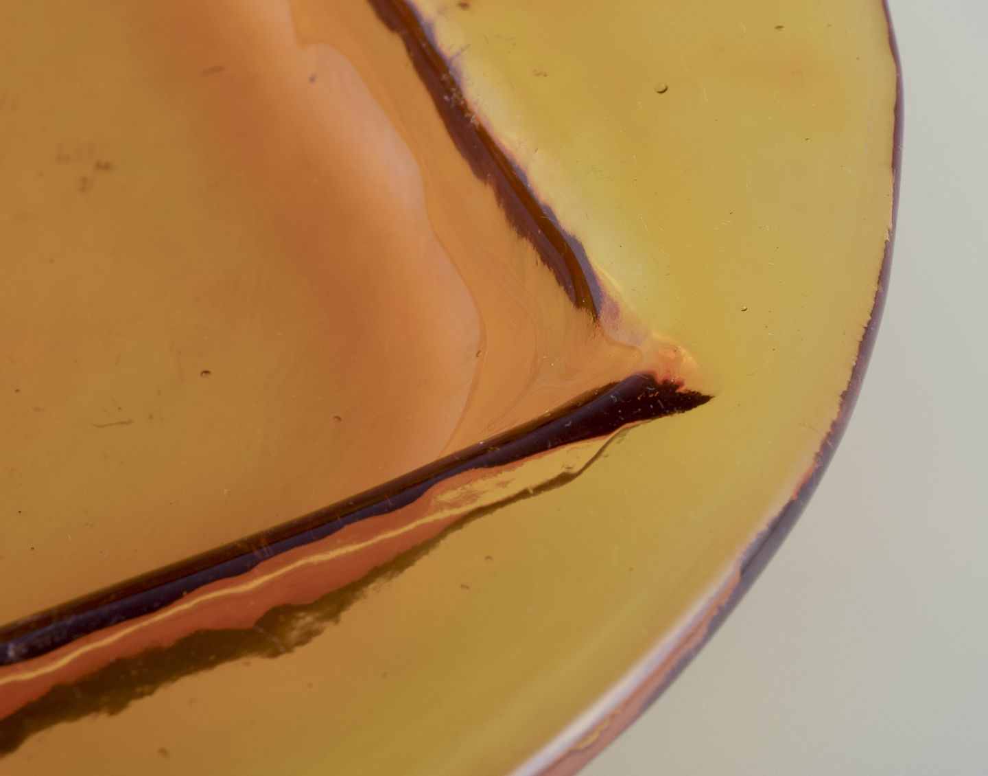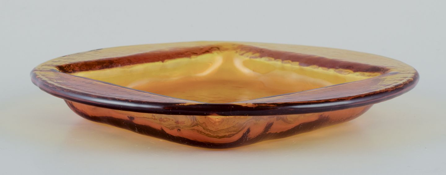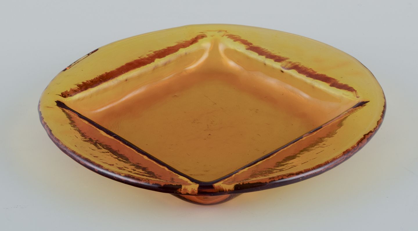 Skandinavisk glasdesigner. Et sæt på fire tallerkener i røgfarvet kunstglas. Kvadratisk fordybning i tallerkenen.