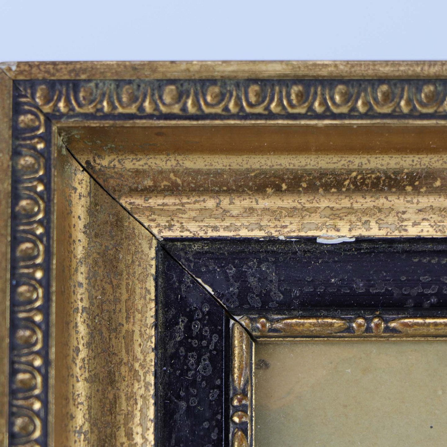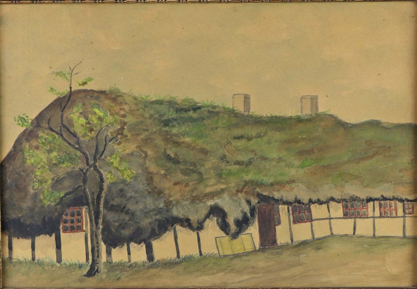 Indrammet akvarel maleri på papir i sort og gylden træramme med naturalistisk motiv af stråtægt bondegård