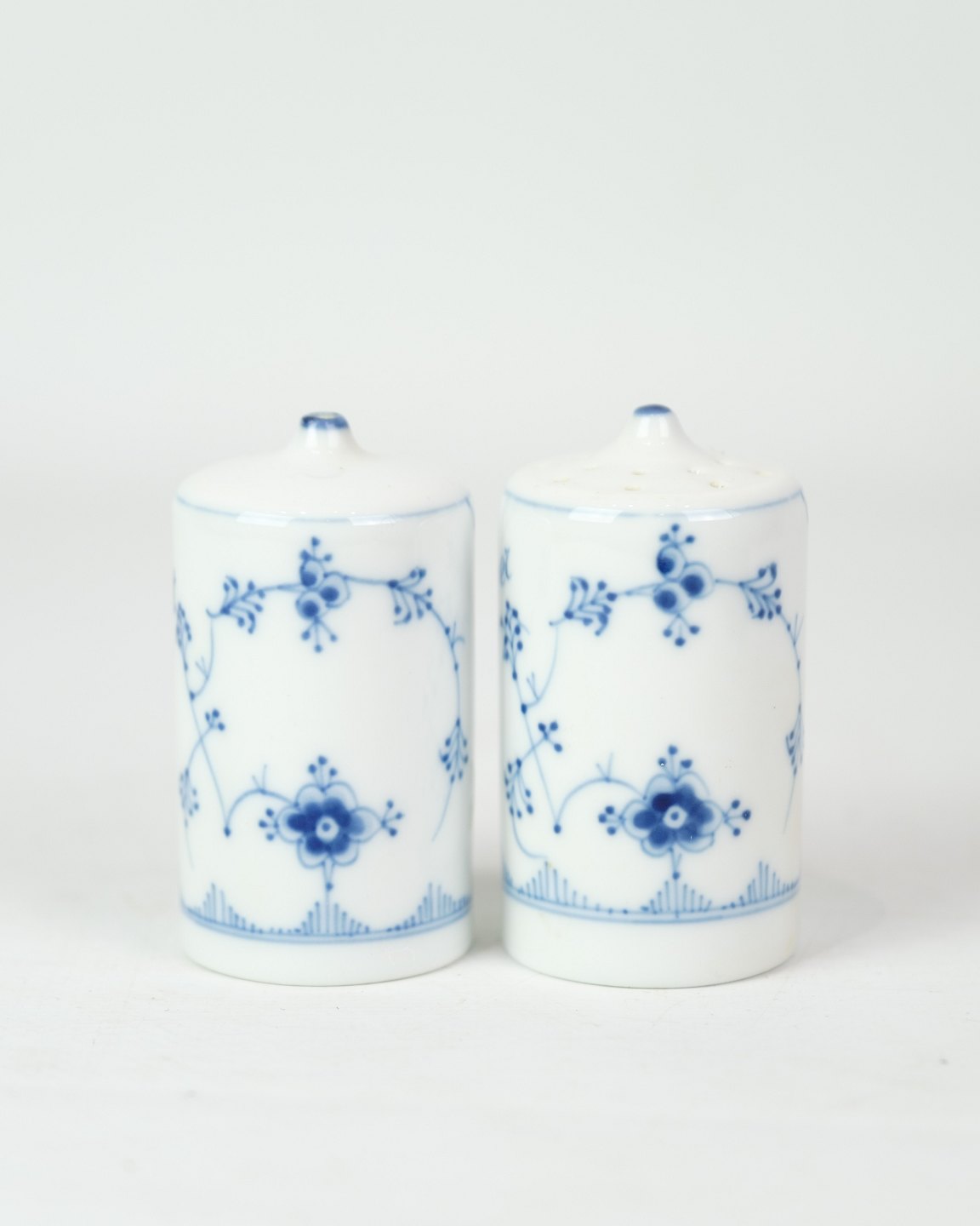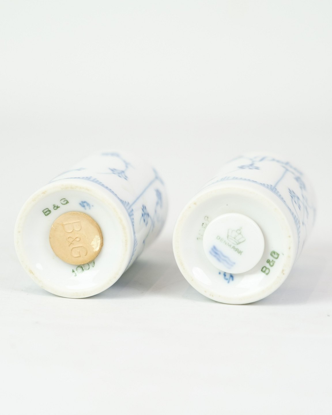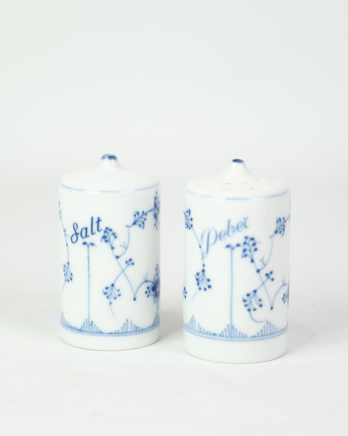 Sæt af salt- og peberbøsser nr. 1097/1098 fra Bing & Grøndahl. Fremstillet i porcelæn med klassisk blåmalet musselmalet dekoration.