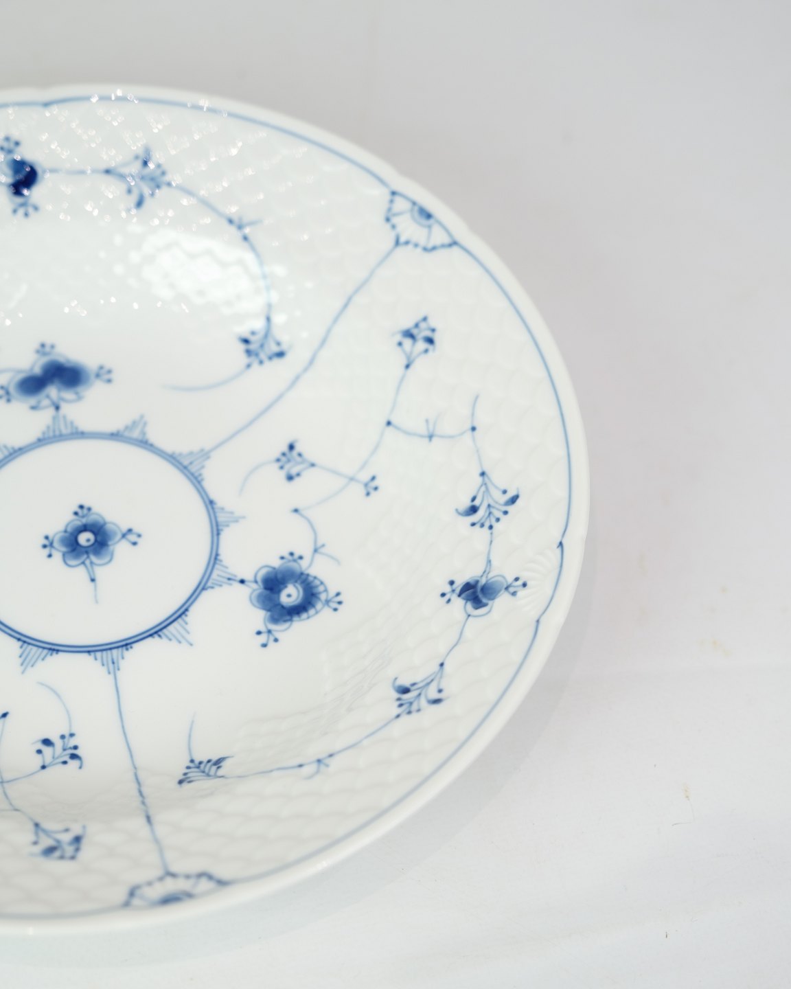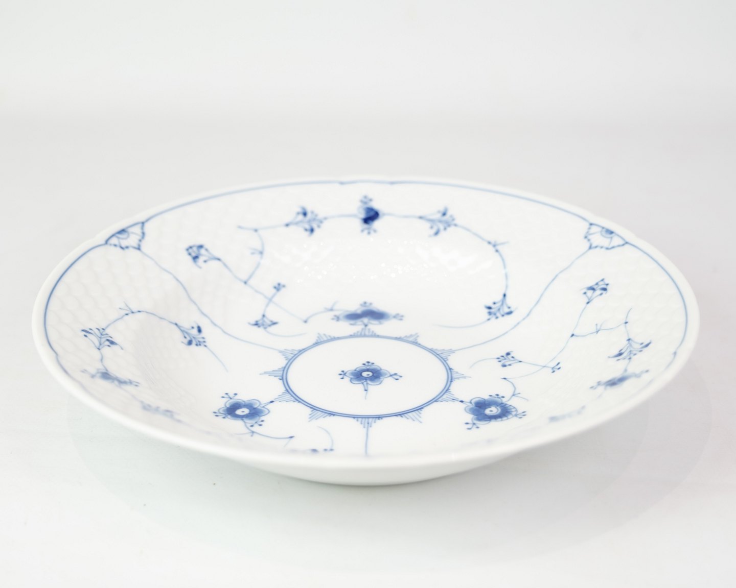 Dyb Tallerken nr. 22 fra Bing & Grøndahl. Fremstillet af porcelæn med klassisk blåmalet musselmalet dekoration.