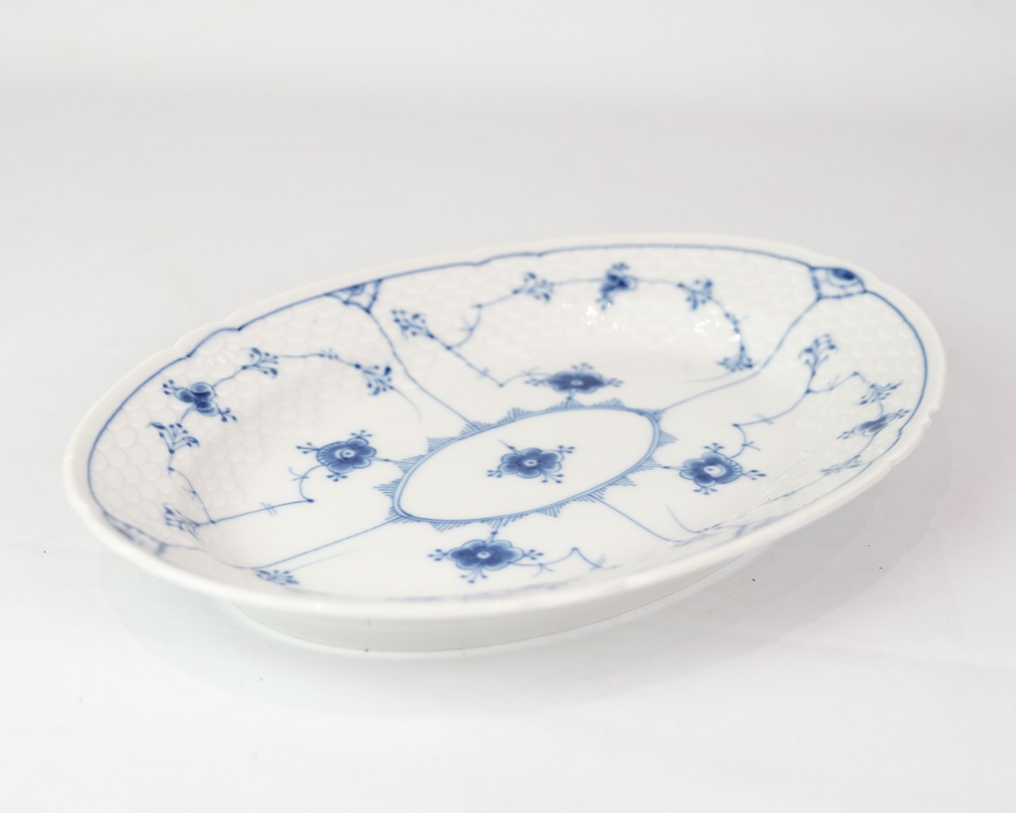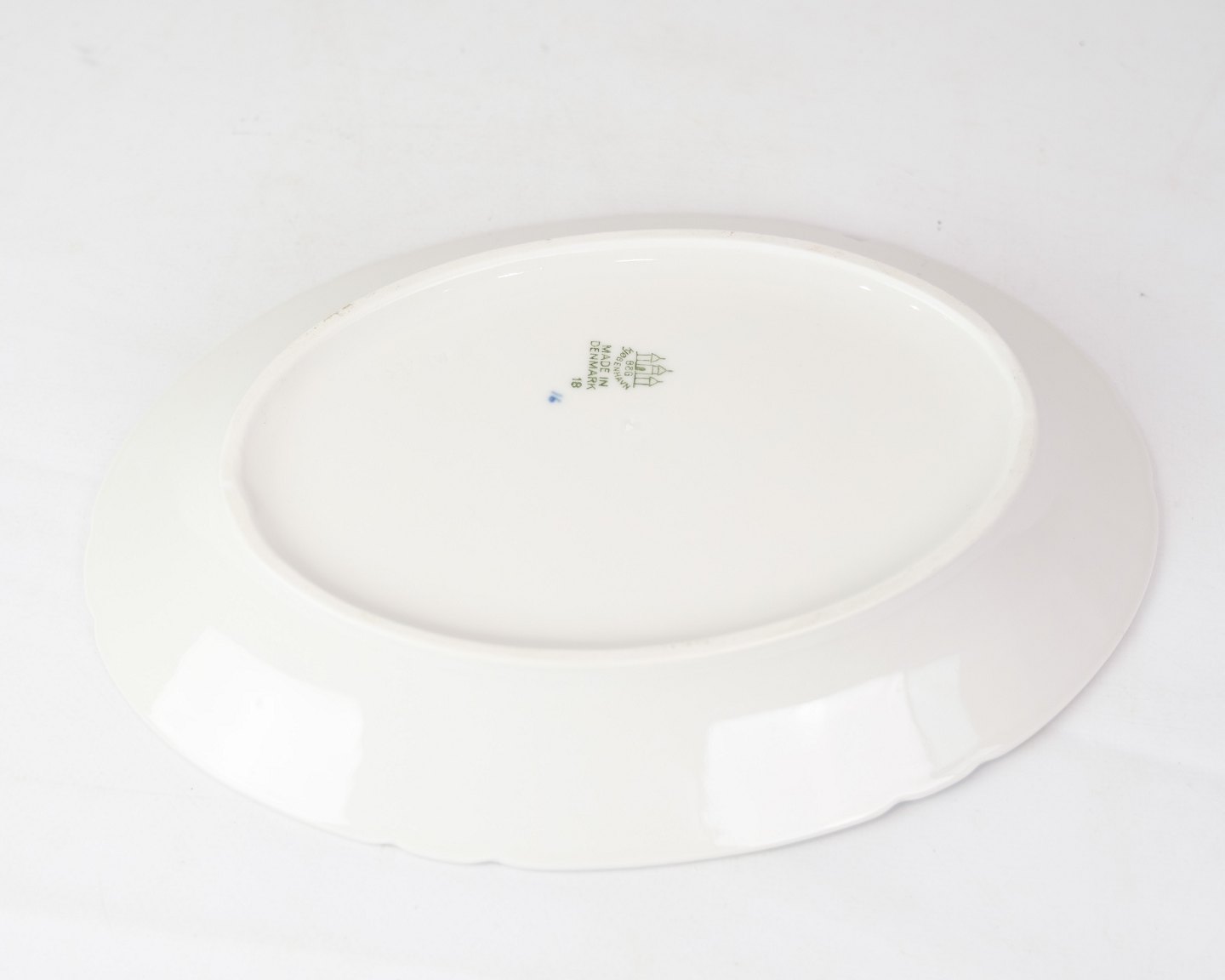 Ovalt fad nr. 18 fra Bing & Grøndahl. Fremstillet i porcelæn med klassisk musselmalet design i håndmalet blå dekoration.