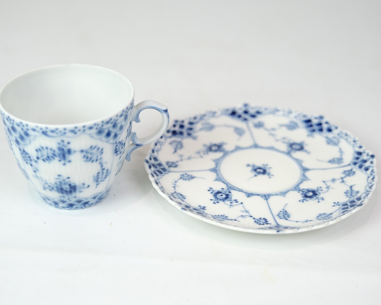 Cup and saucer of the pattern Full lace blue fluting made by Royal Copenhagen with model no. 1 / 1035. The full lace set was first presented by Royal Copenhagen in 1886 with inspiration from Chinese style.