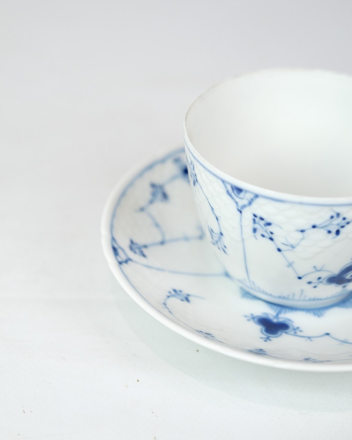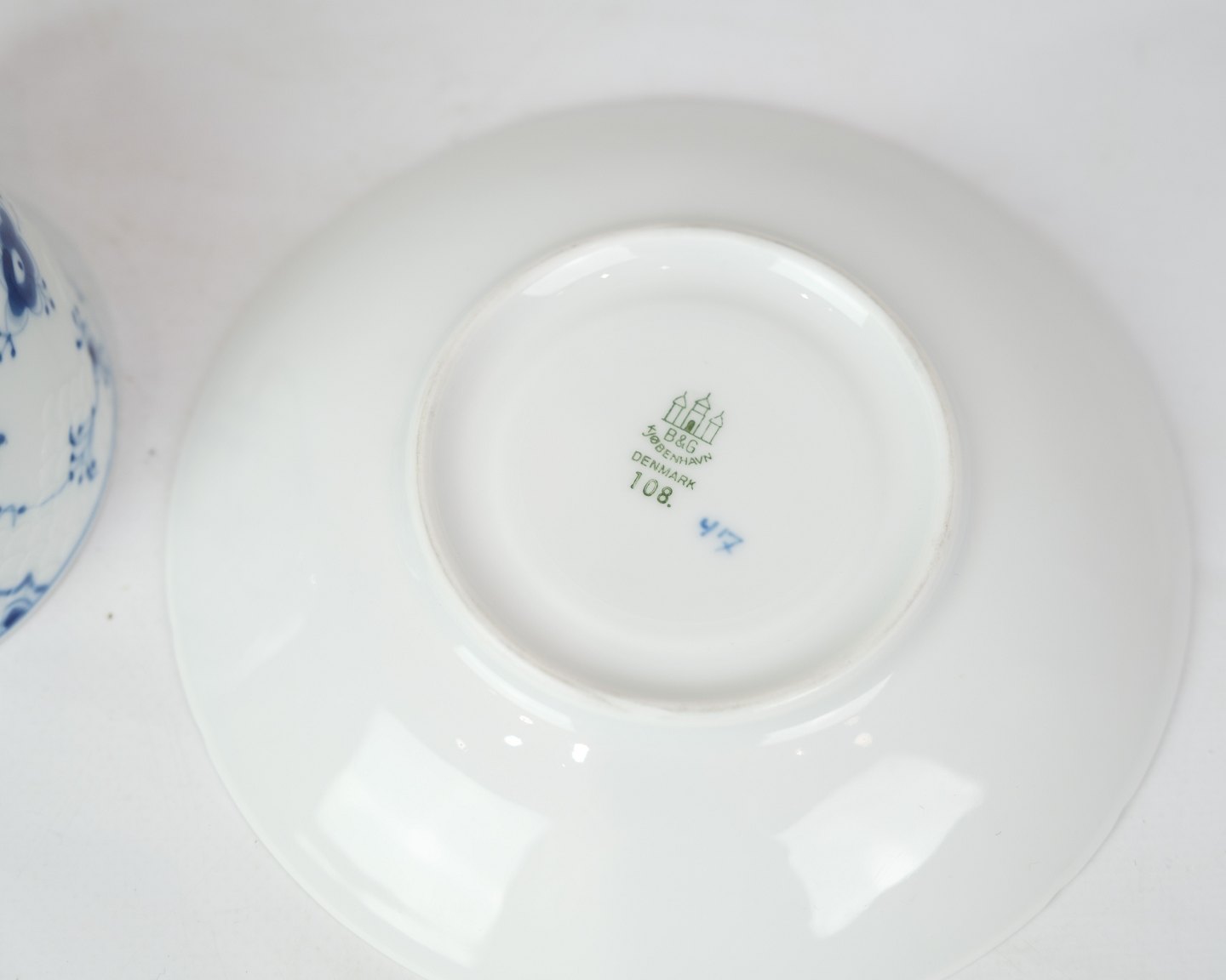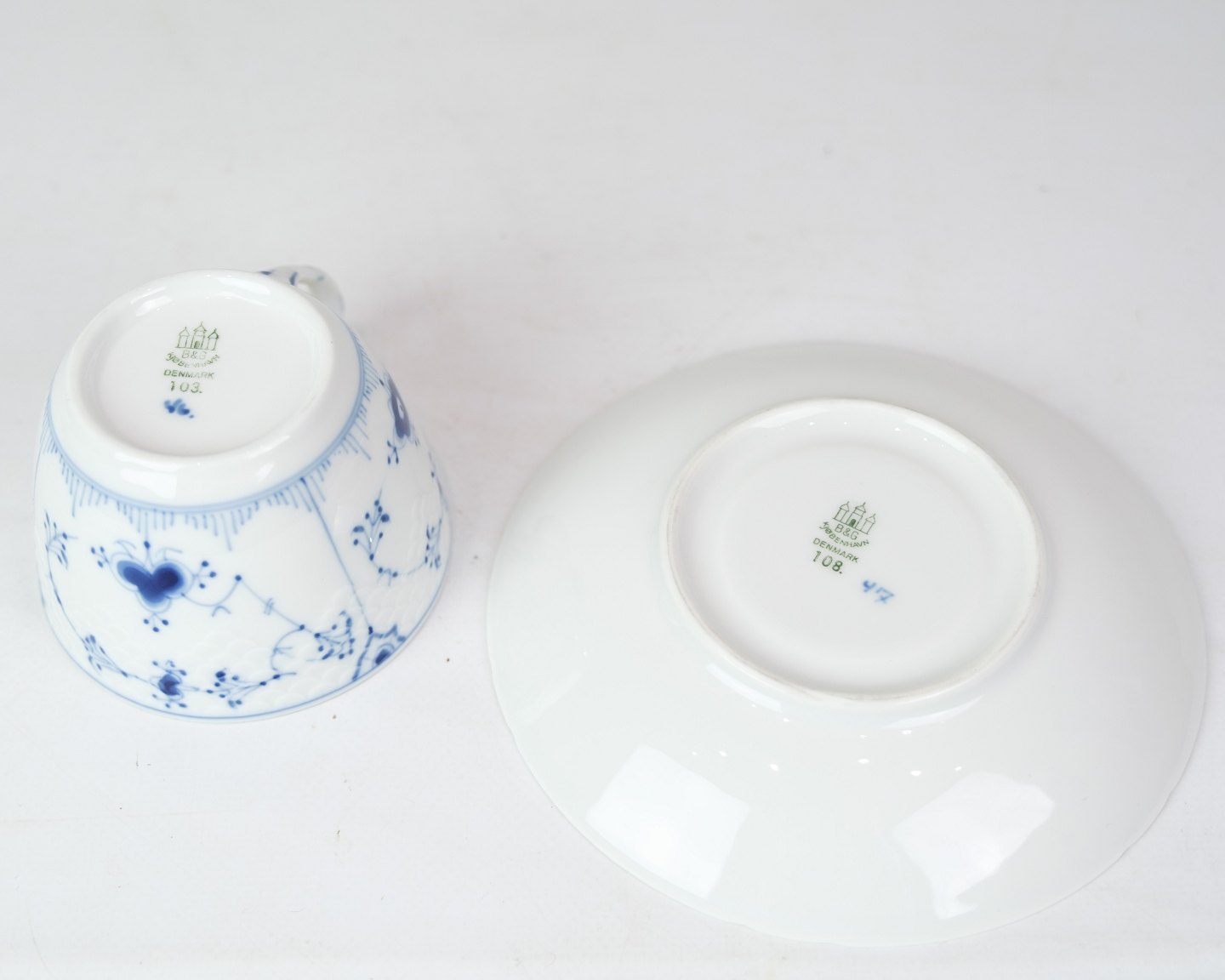 Kop med underkop i mønstret blåmalet / musselmalet fremstillet af B&G med underkop nr. 108 og Kop nr. 202.