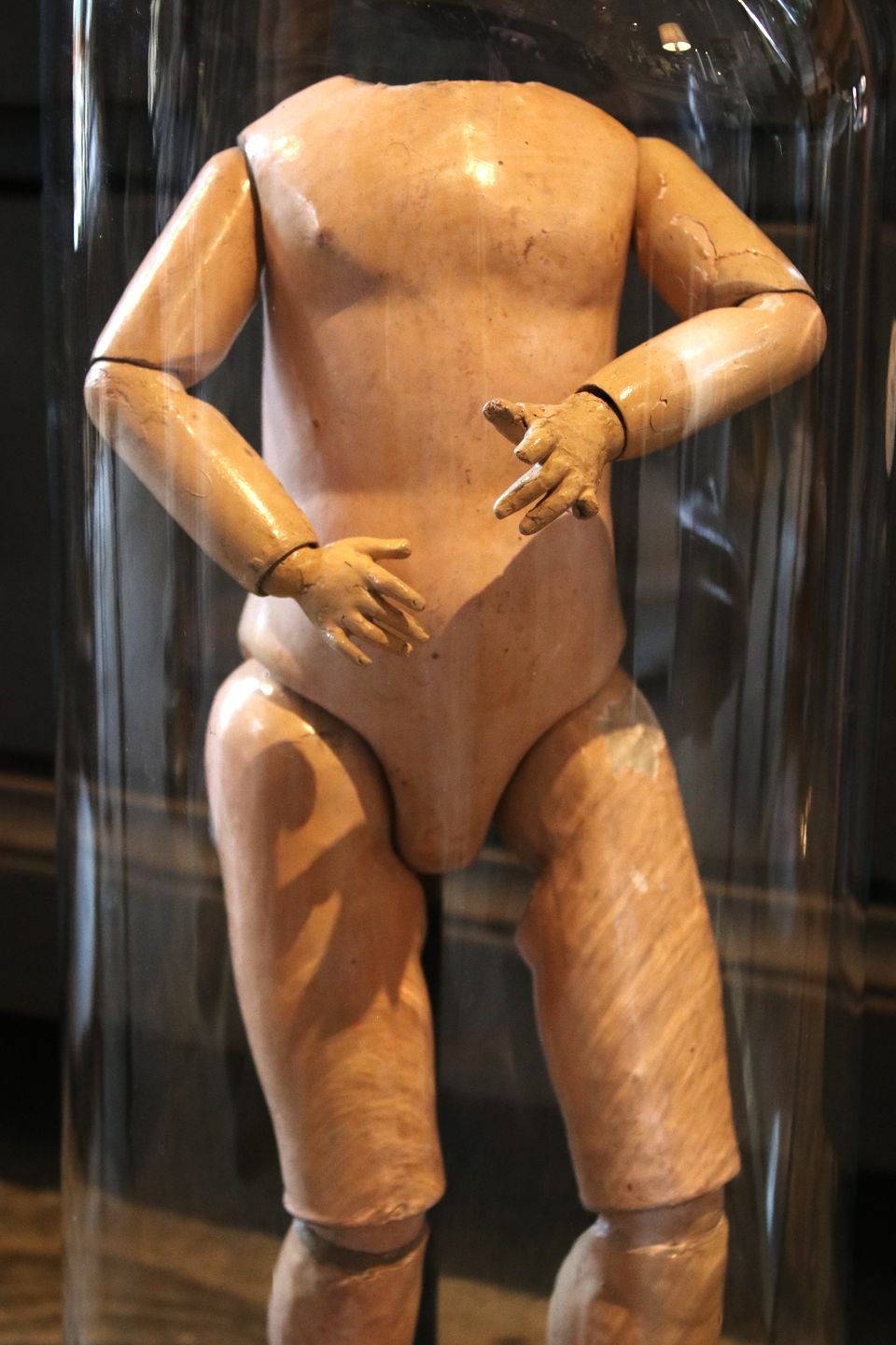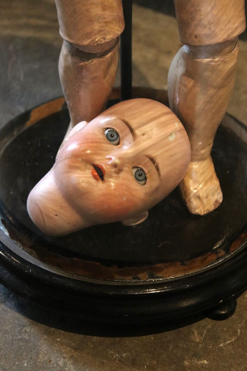 Gammel fransk cylinderformet glas globe med fast monteret "kunst" installation af gammel dukke krop i bemalet papmache og dukke hoved i porcelæn med glasøjne. H: 52cm. Dia.: 23cm.