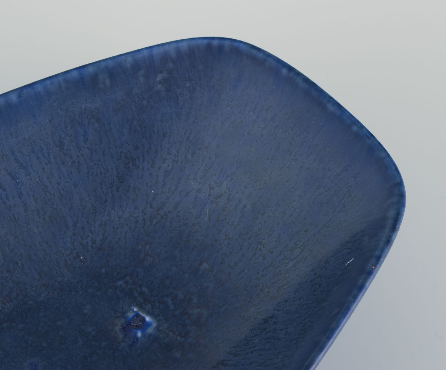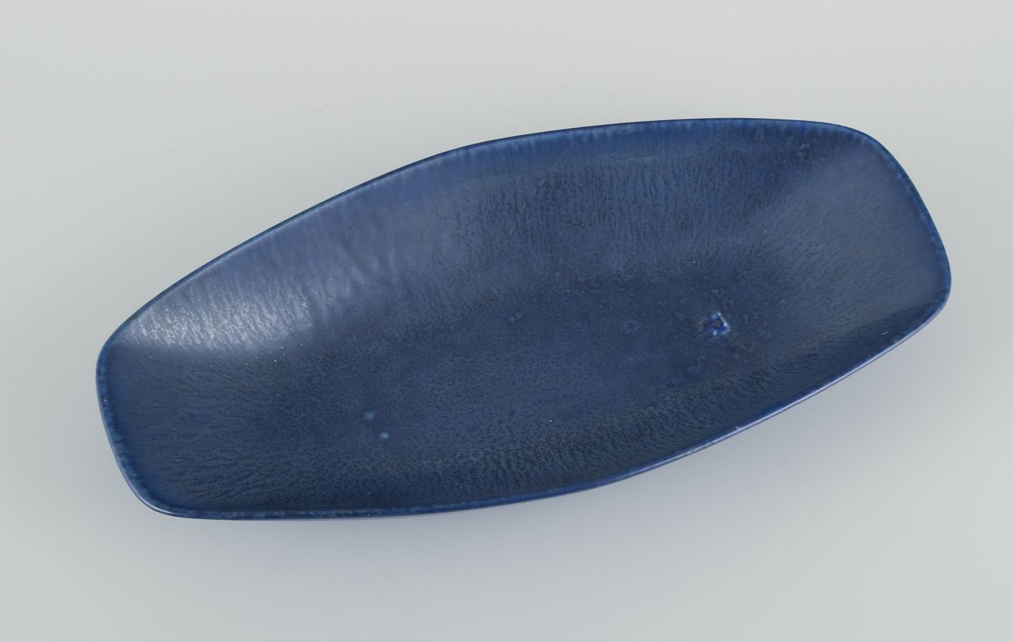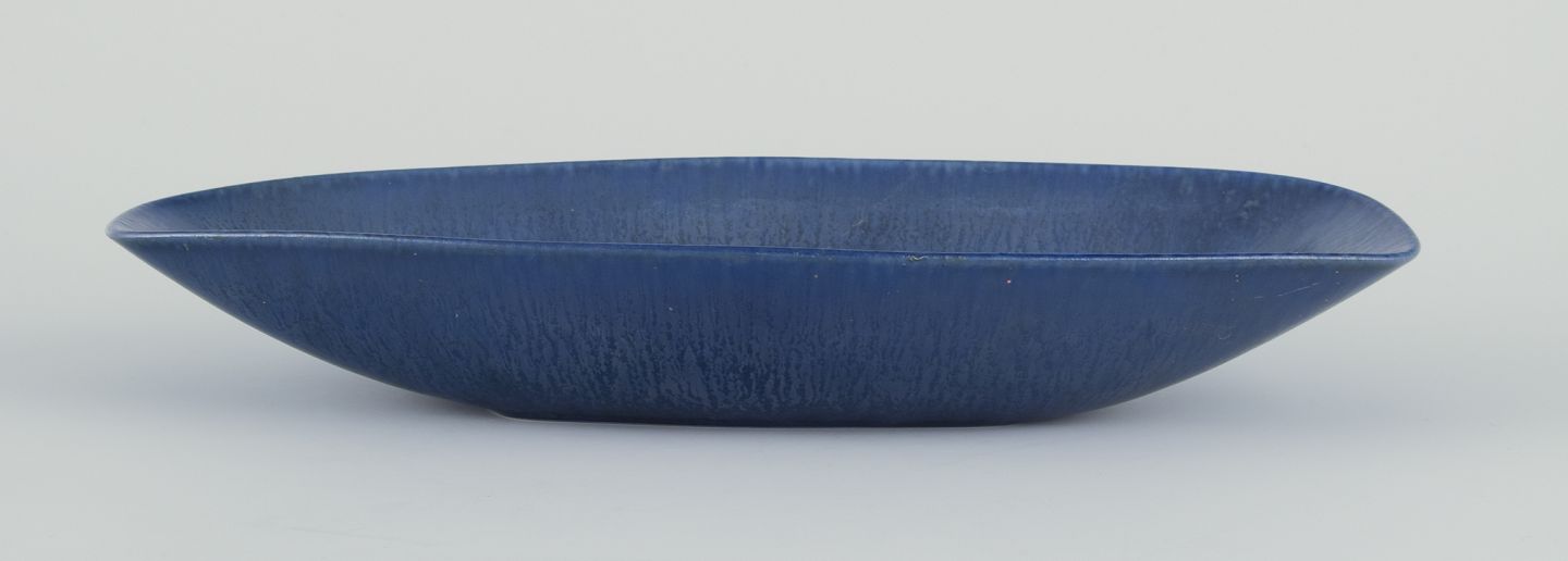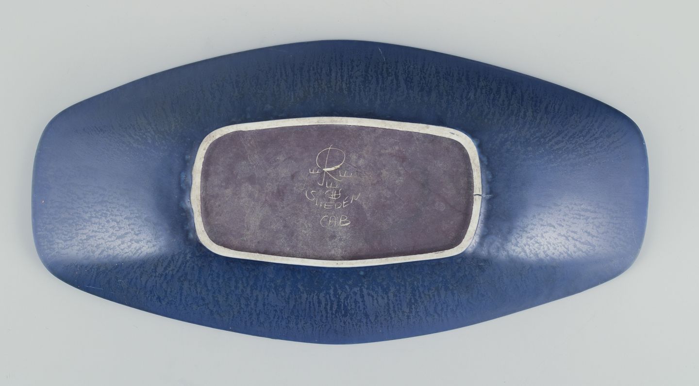 Aflangt fad af stentøj. Glasur i blå toner.