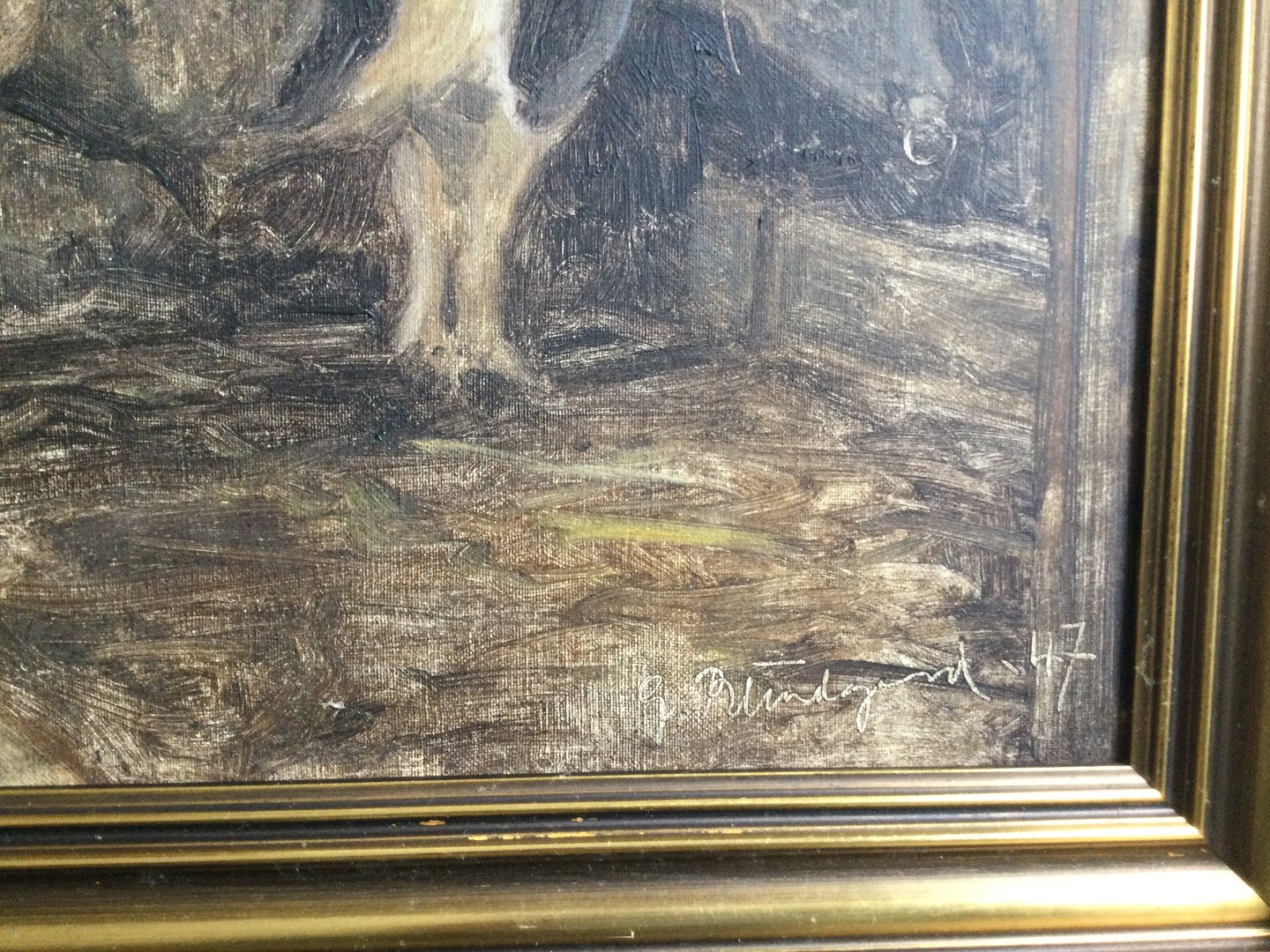 Maleri af Gunner Bundgaard 1947 - Stald interiør med tyr.