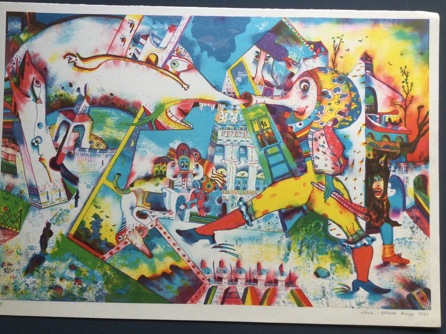 Litografi af Anne-Marie Brauge 1991 - Surrealistisk komposition.