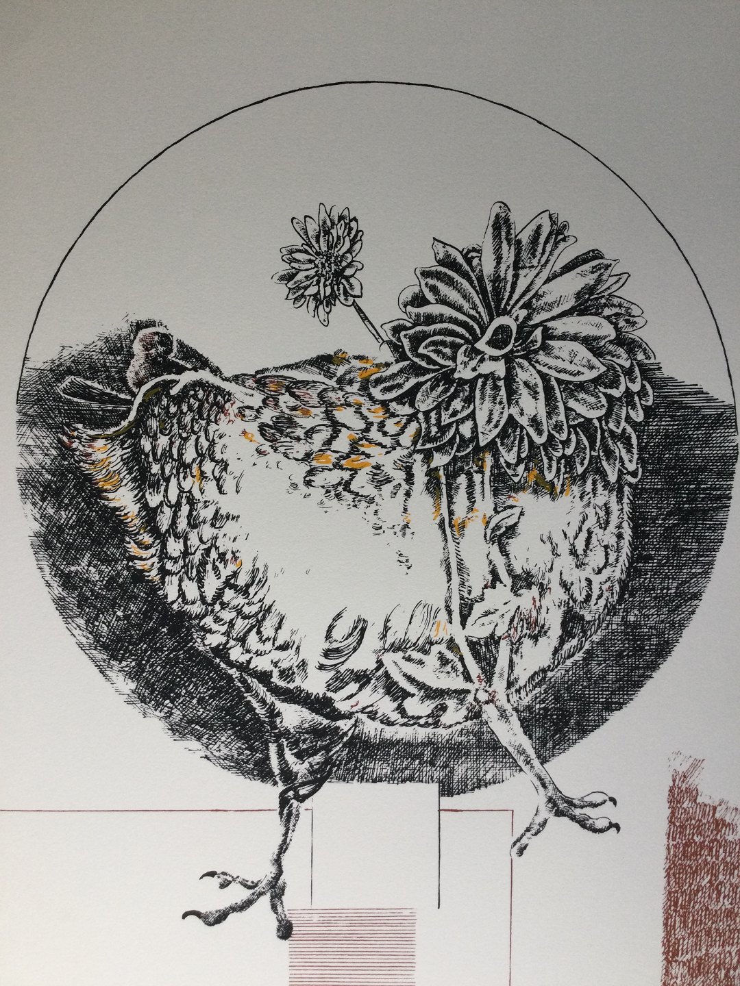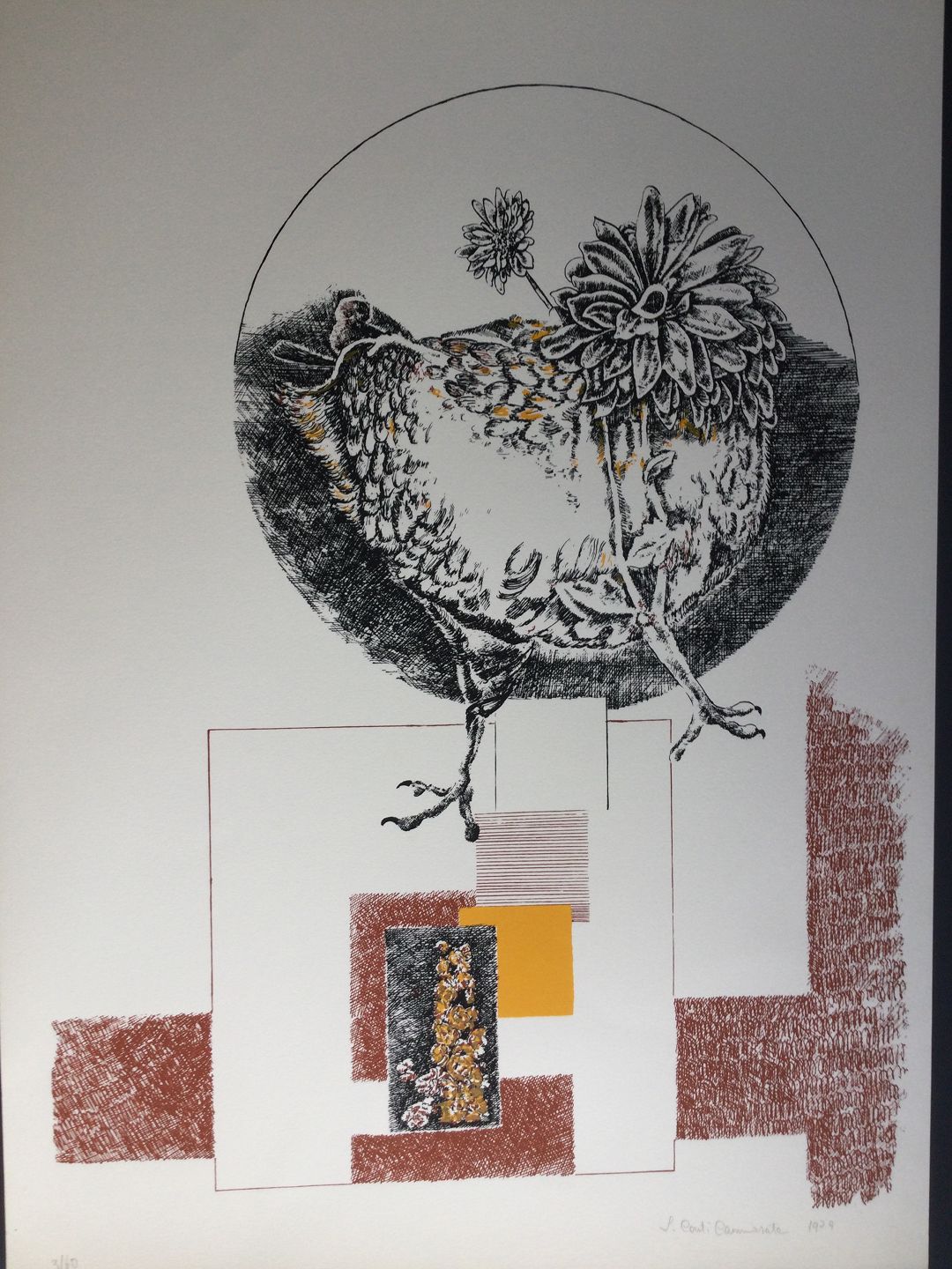 Litografi 1979 - Surrealistisk komposition med høne.