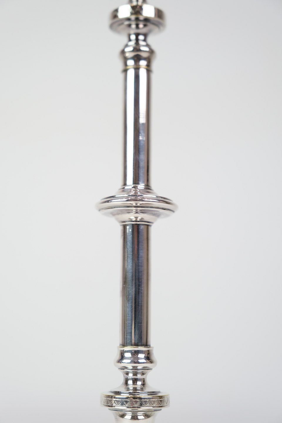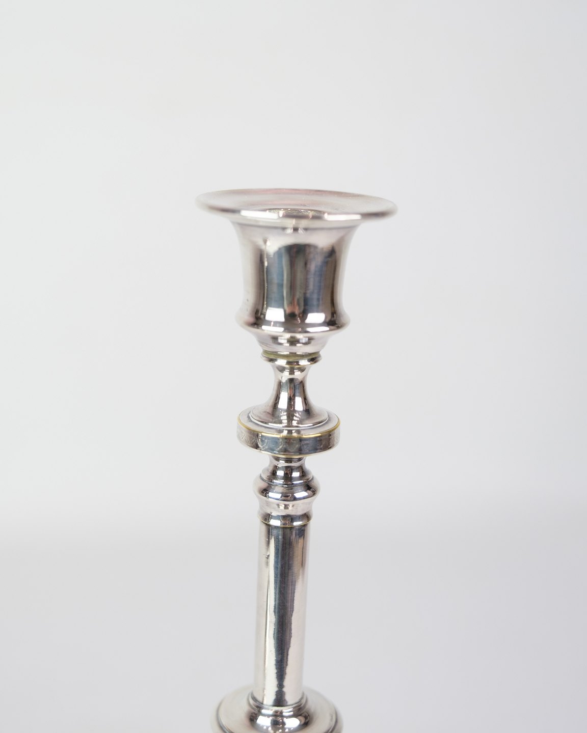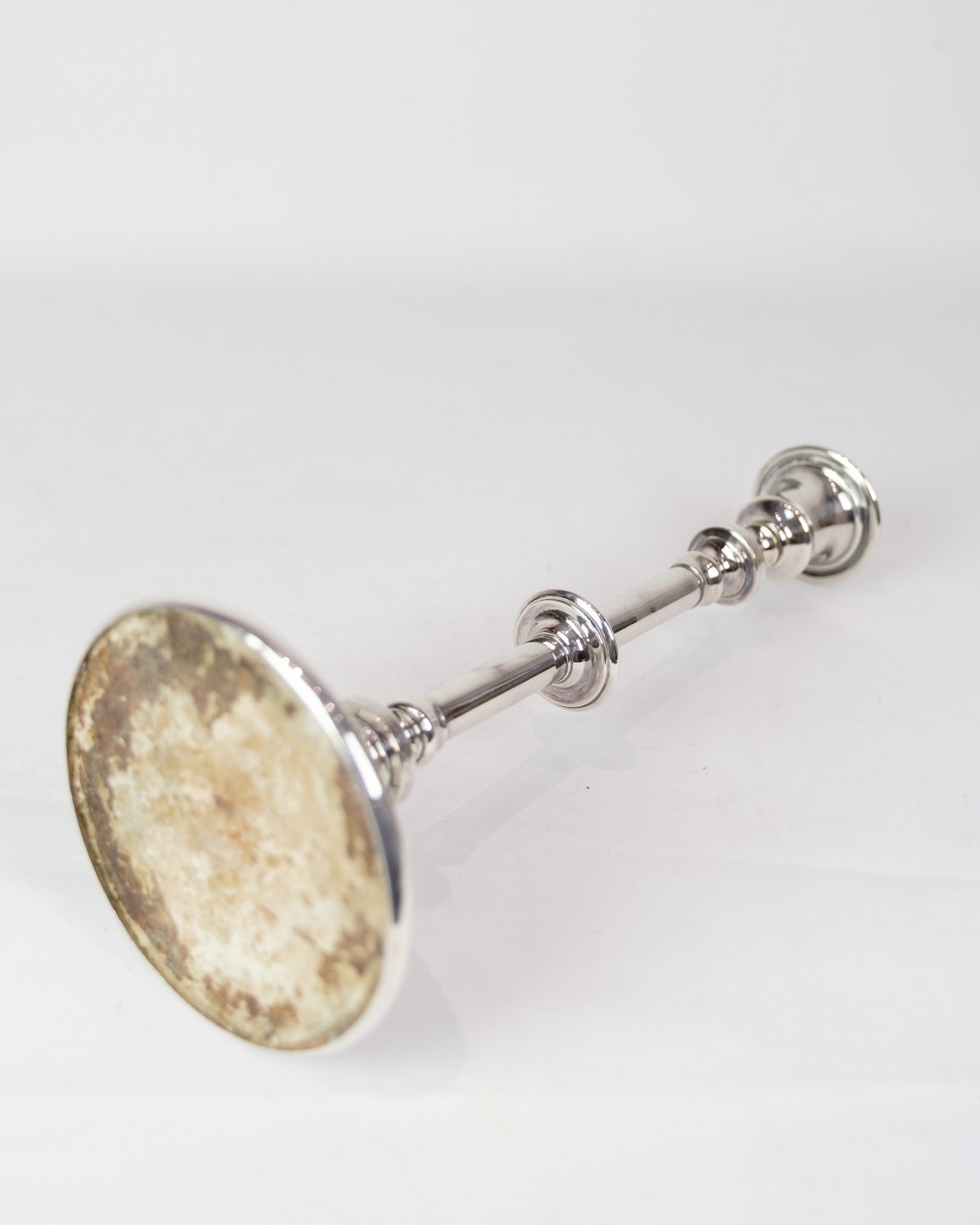 Sæt af 2 høje lysestager fra 1920’erne, forsølvet metal. Klassisk design med drejet skaft, profilerede detaljer og klokkeformet top