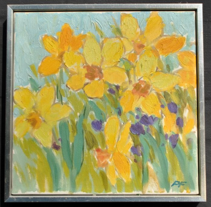 Flemming, Per (1940 - ) Danmark: Påskeliljer. Olie på lærred. Signeret. 30 x 30 cm.