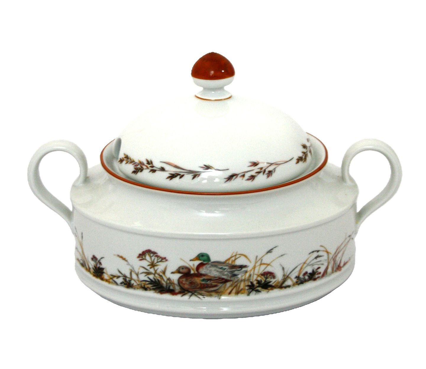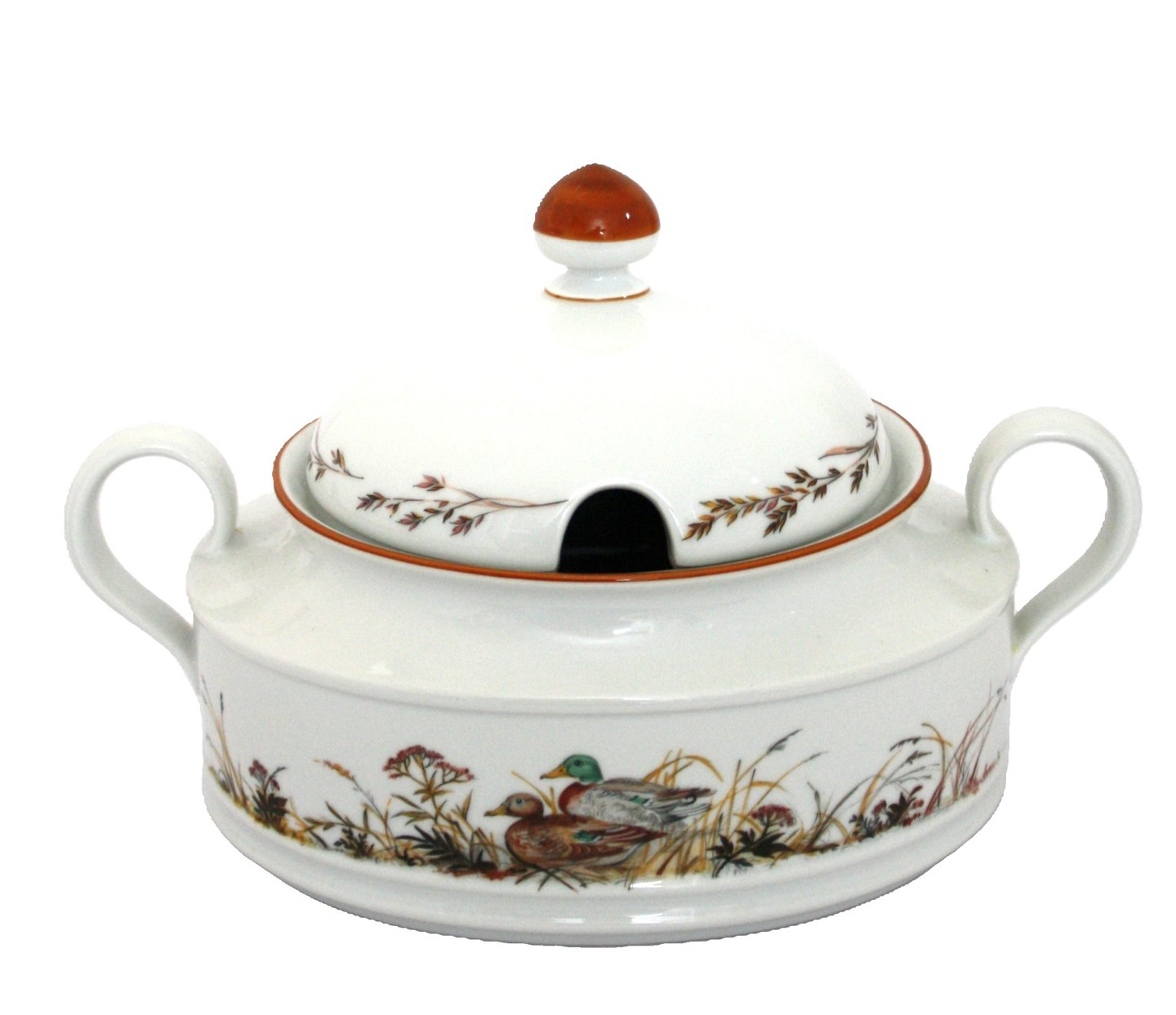 Jagtstellet designet af Mads Stage for Imerco. Ragoutfad med låg, Terrin med Gråand motiv. 2,2 ltr. Højde 18,5 cm. Bredde 19 cm. Længde 29 cm. Pris: 1100 kr. stk. Lager: 1
