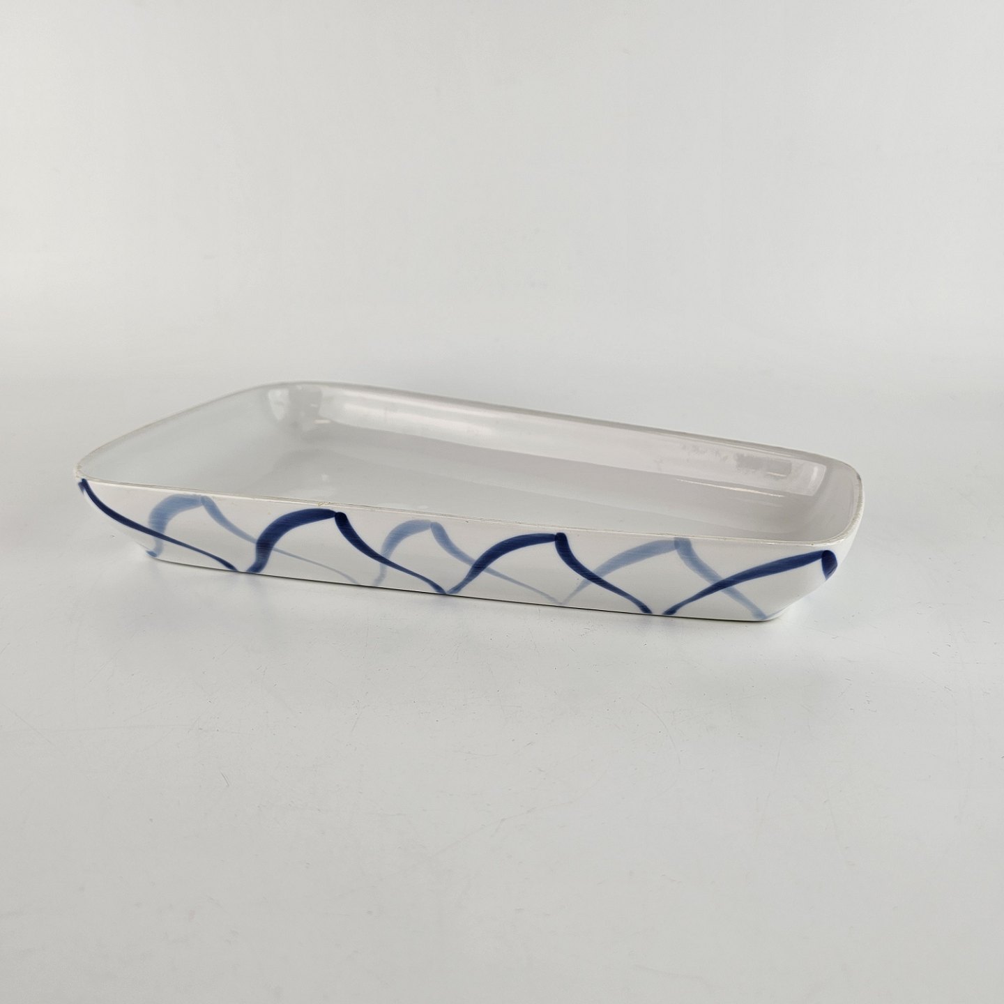 Blå Flamme er hvidt ildfast porcelæn, dekoreret med blå striber, der ligner flammer.