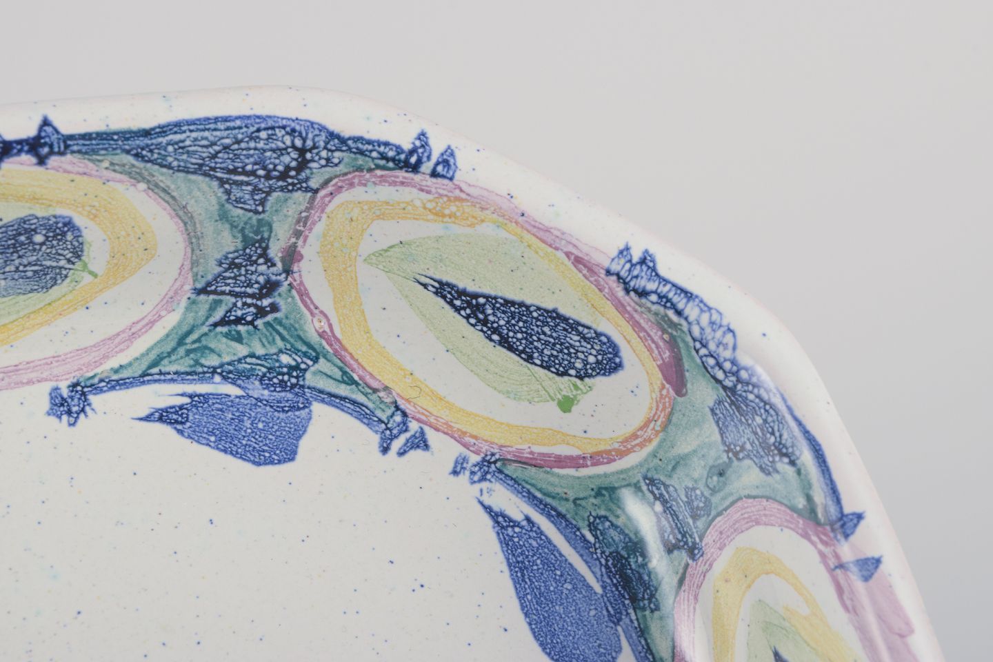 Decorated with polychrome glaze on a light gray base.