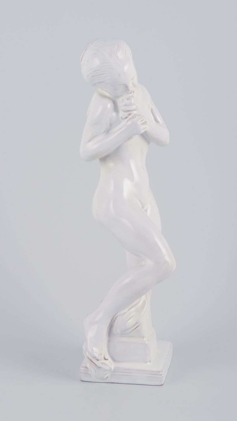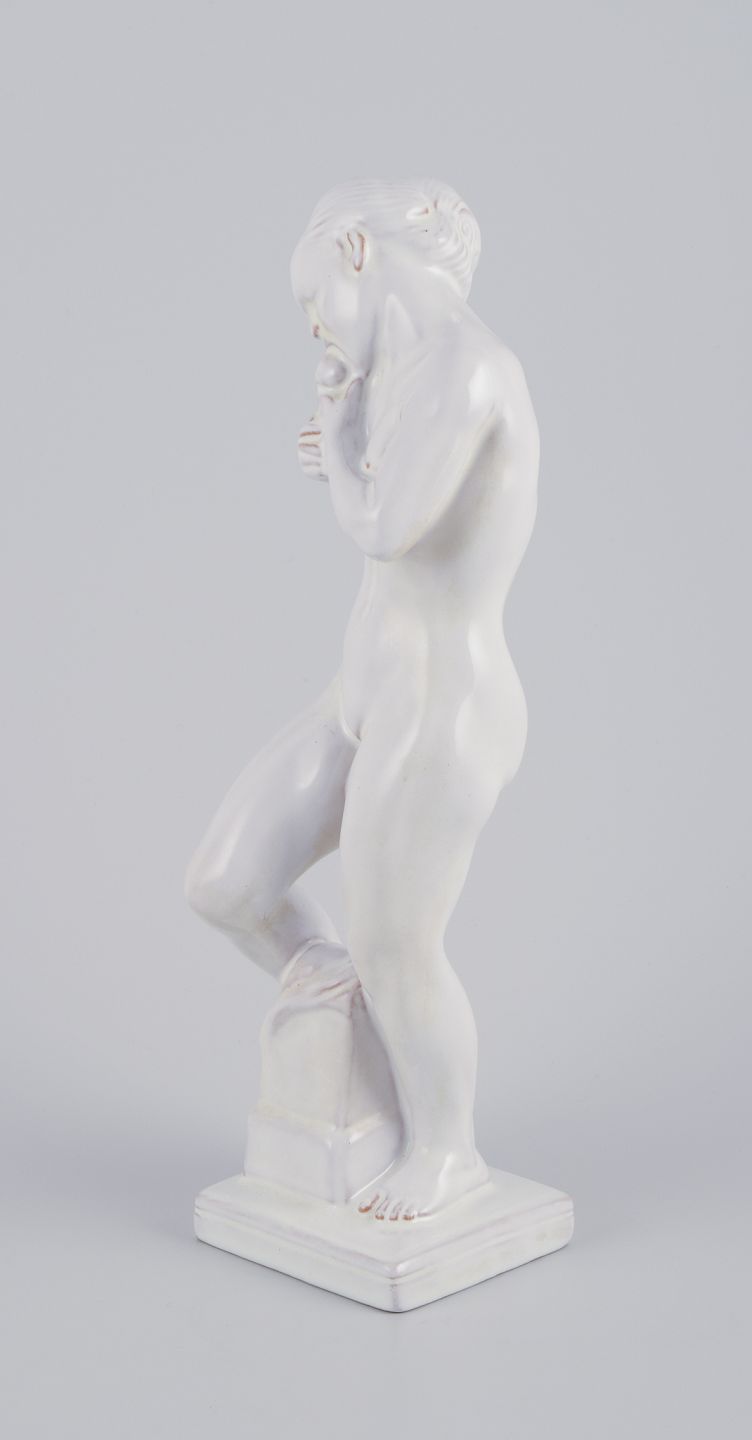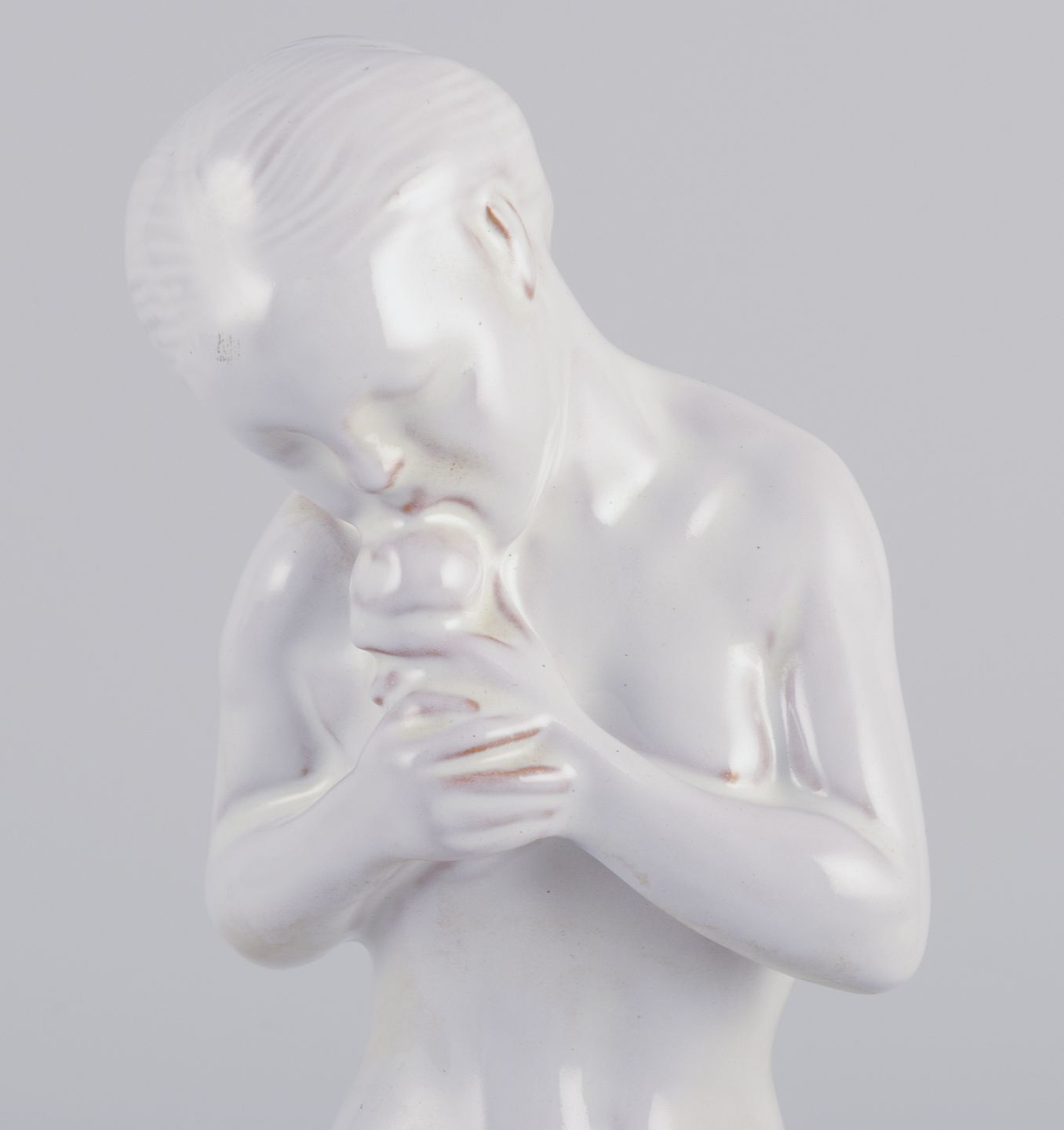"Eva med æblet". Hvidglaseret figur af lertøj.