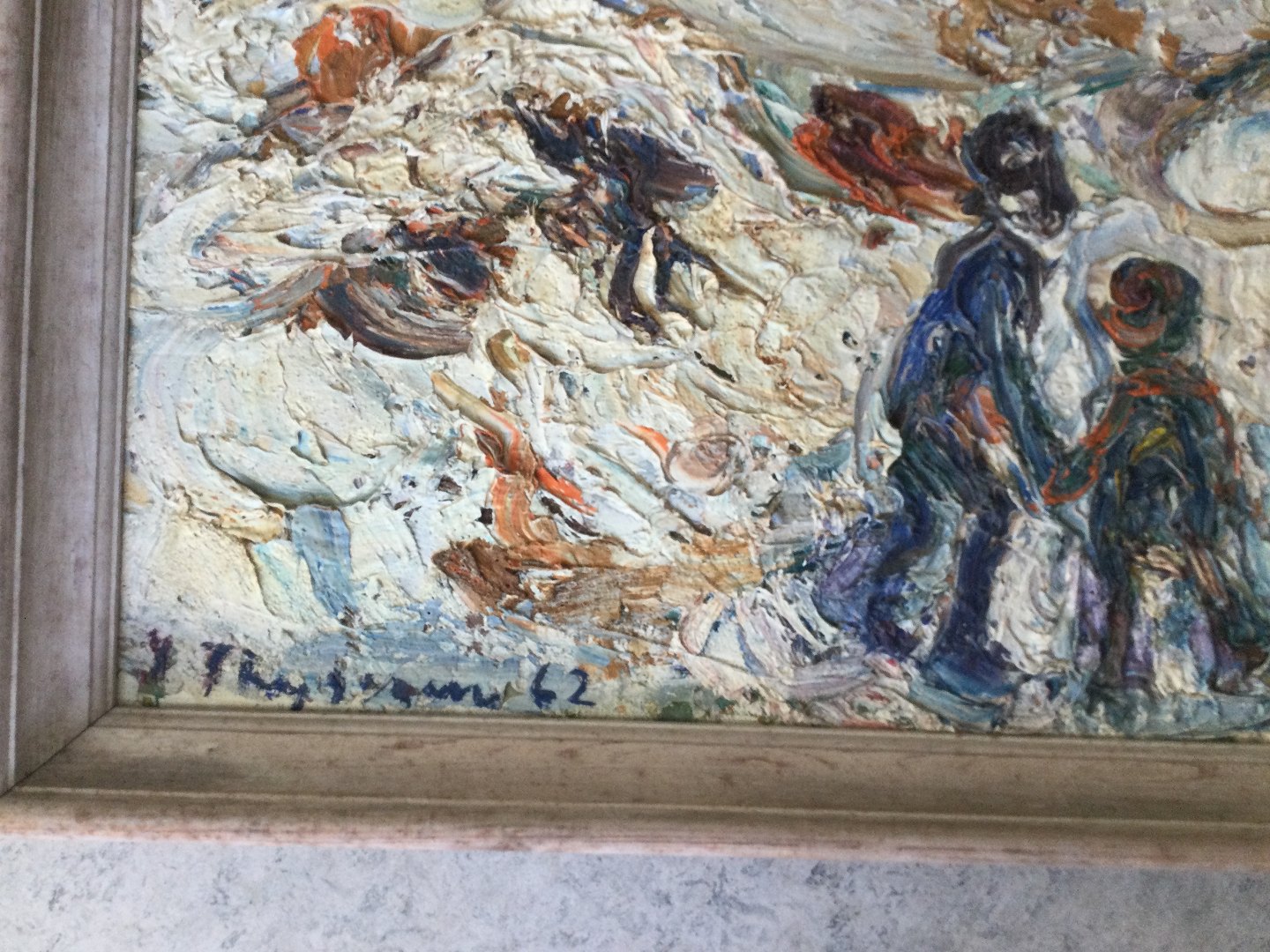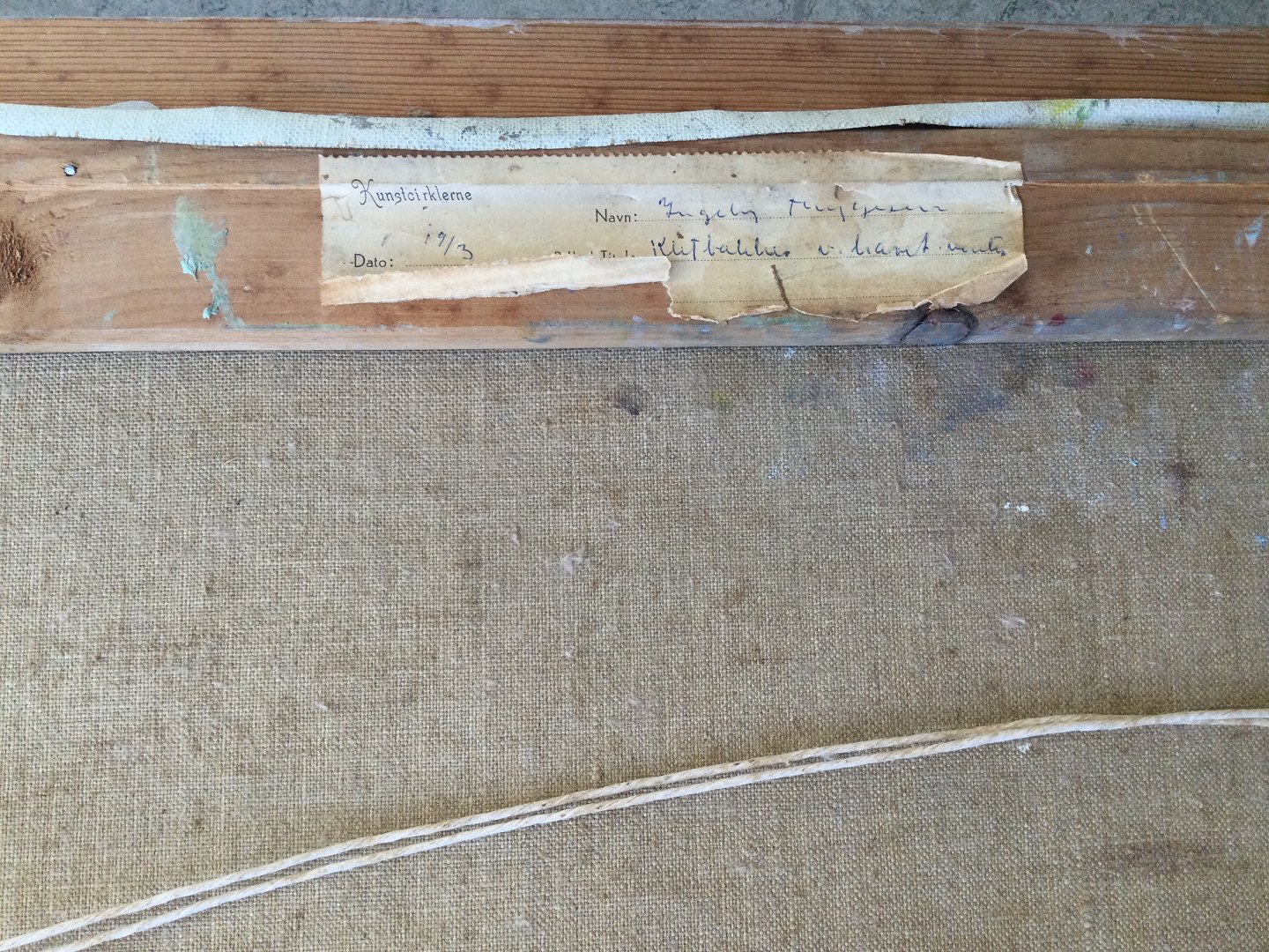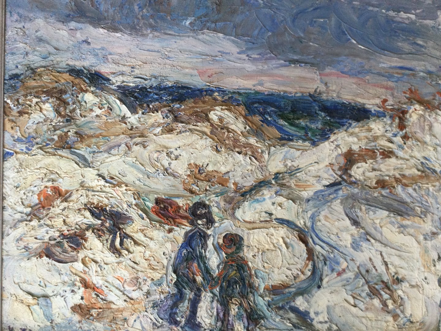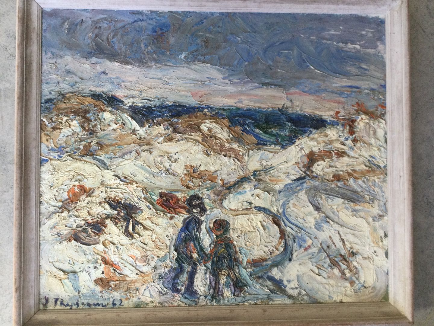 Text available in Danish: Maleri af Ingeborg Thygesen 1962 - Klitbakker ved havet, vinter.