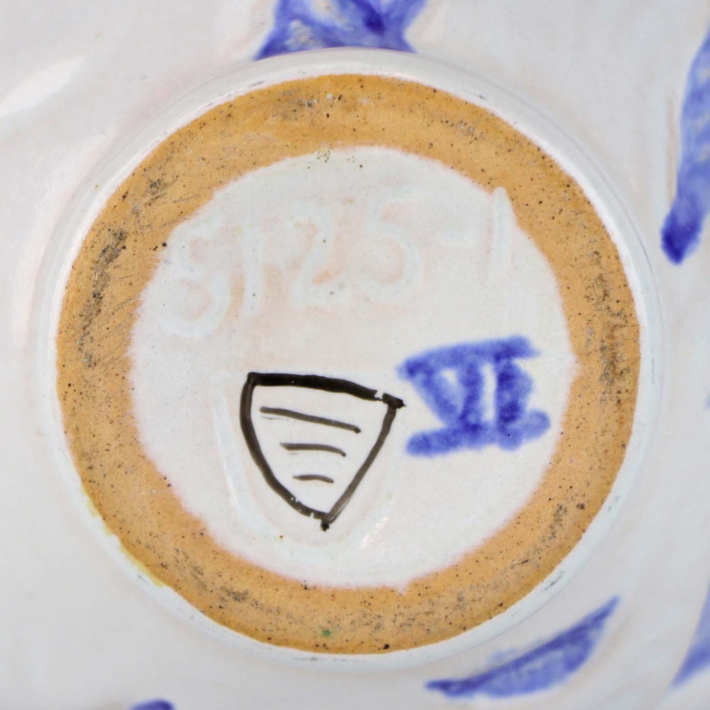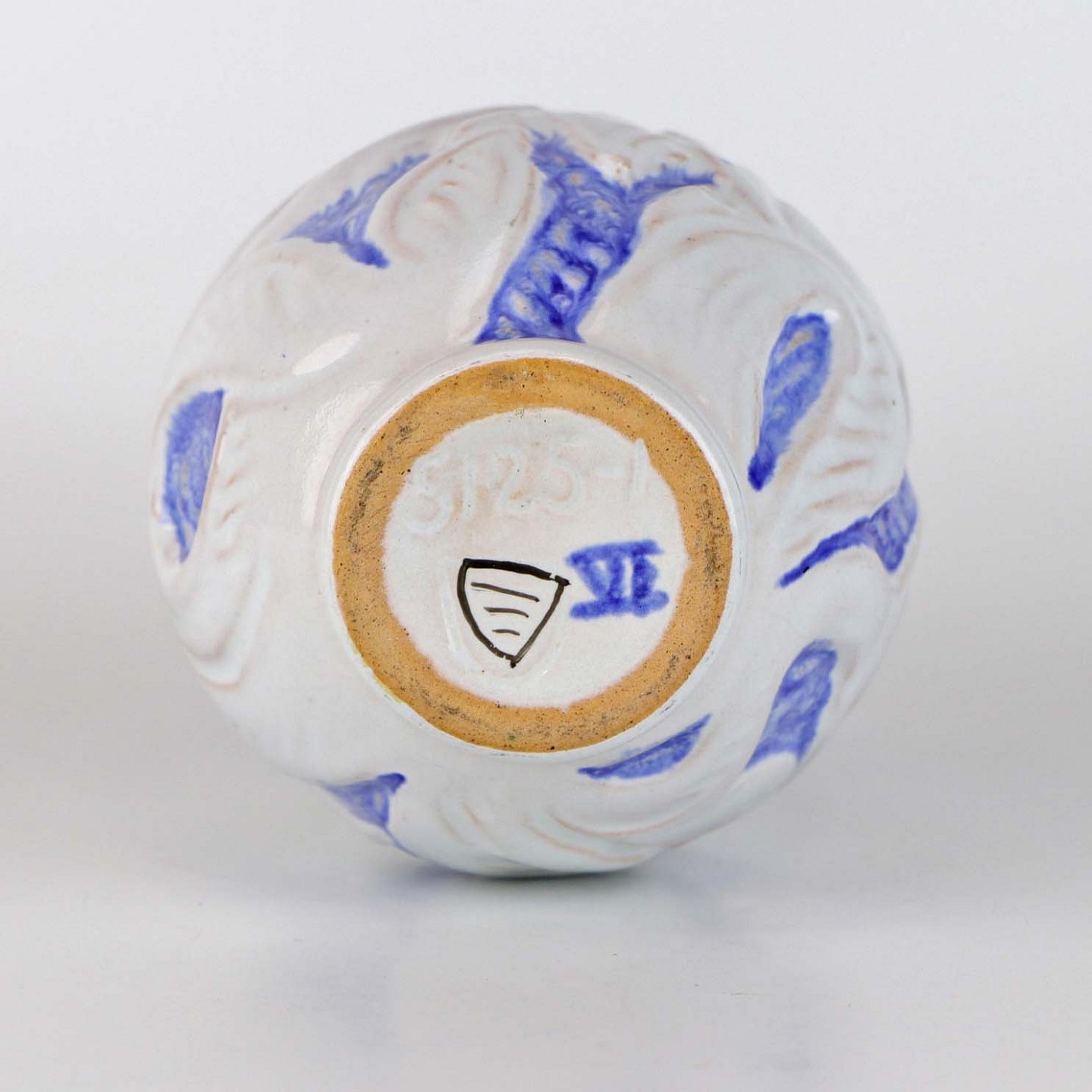 Æggeformet vase i keramik med motiv af hvidglaserede blomster og blade på blåglaseret baggrund. Nr. 5125-1