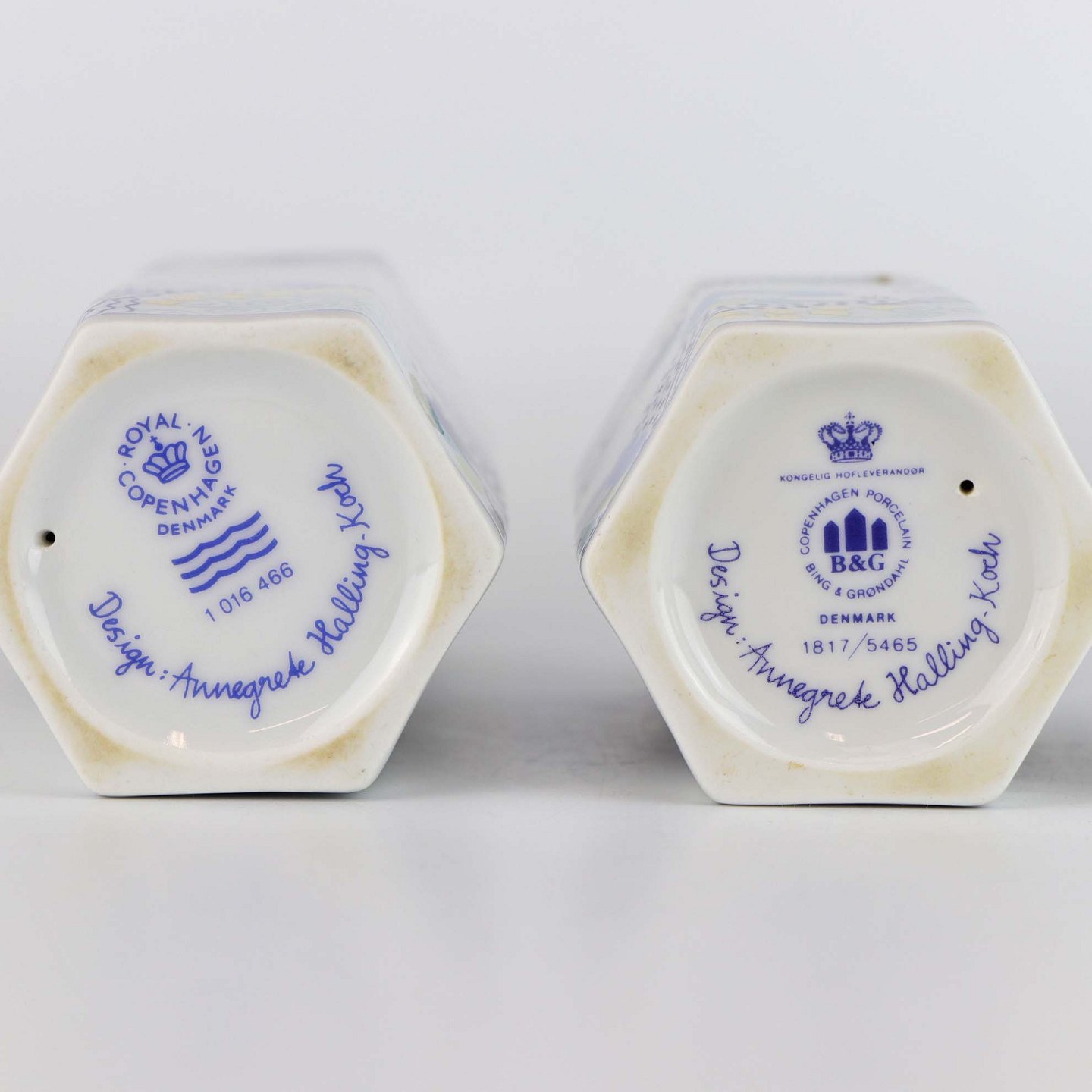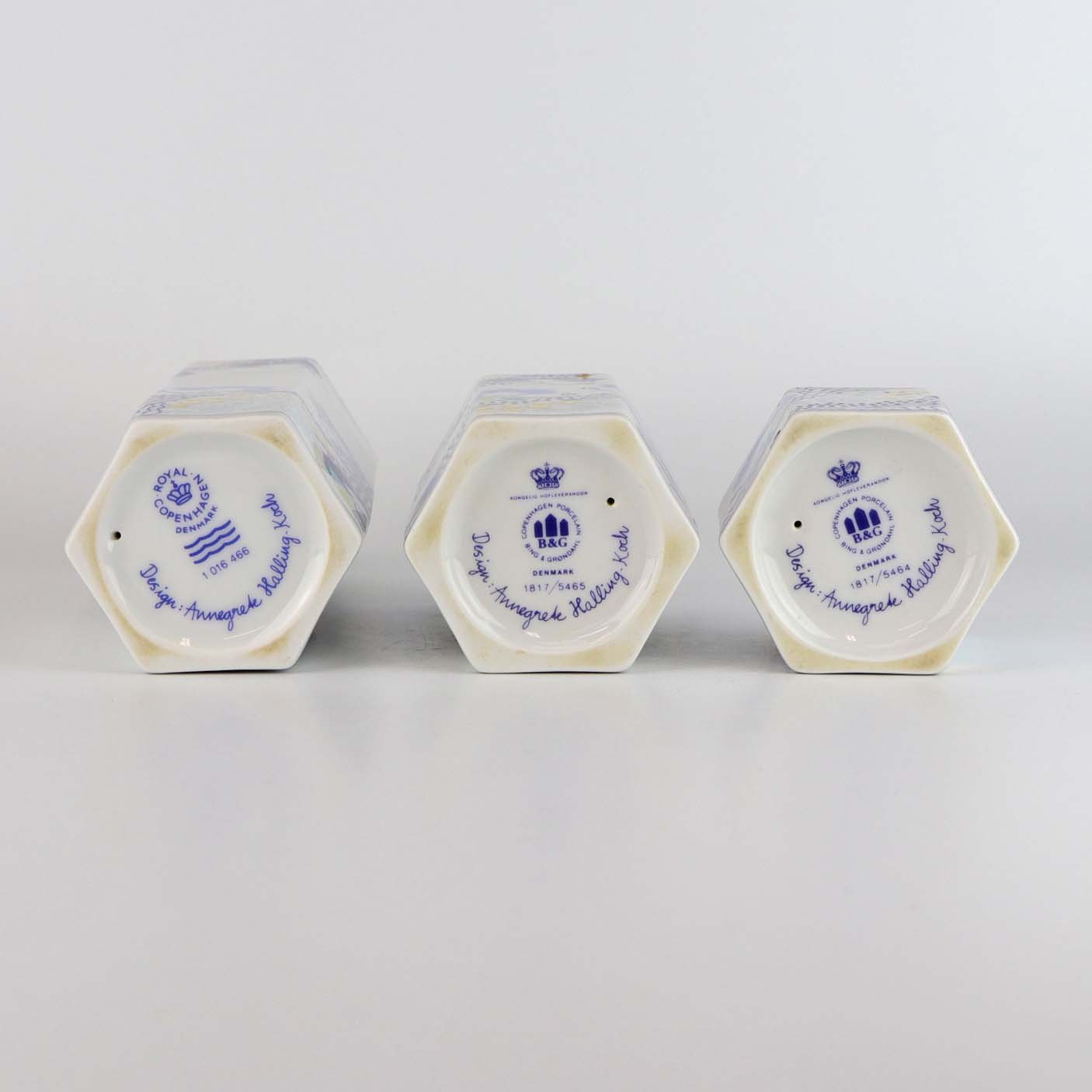 Text available in Danish: Et sæt i hvidt porcelæn med tre fyrfadsstager i tre forskellige højder. Sættet er i blå og grøn streg dekoreret med blomster og guld motiv. Nr. 1 016 466, 1817/6465 og 1817/5464