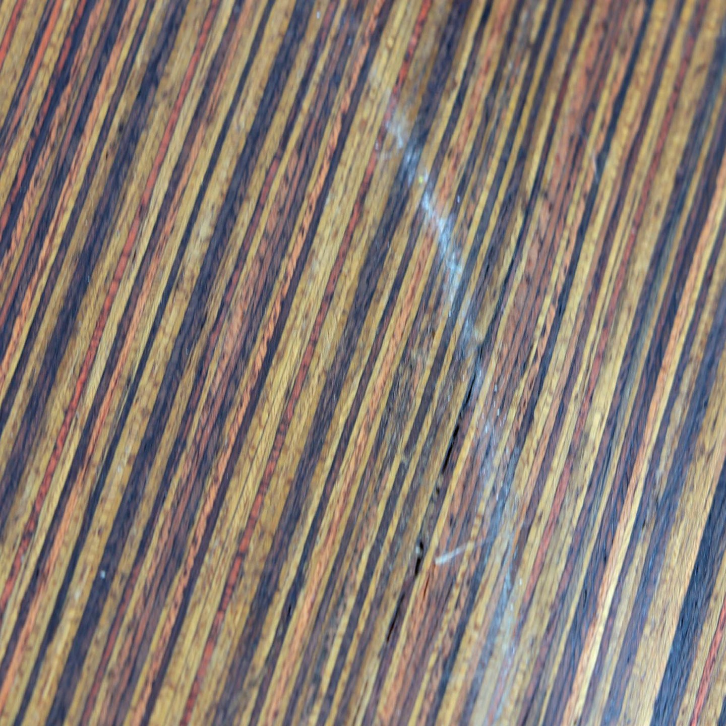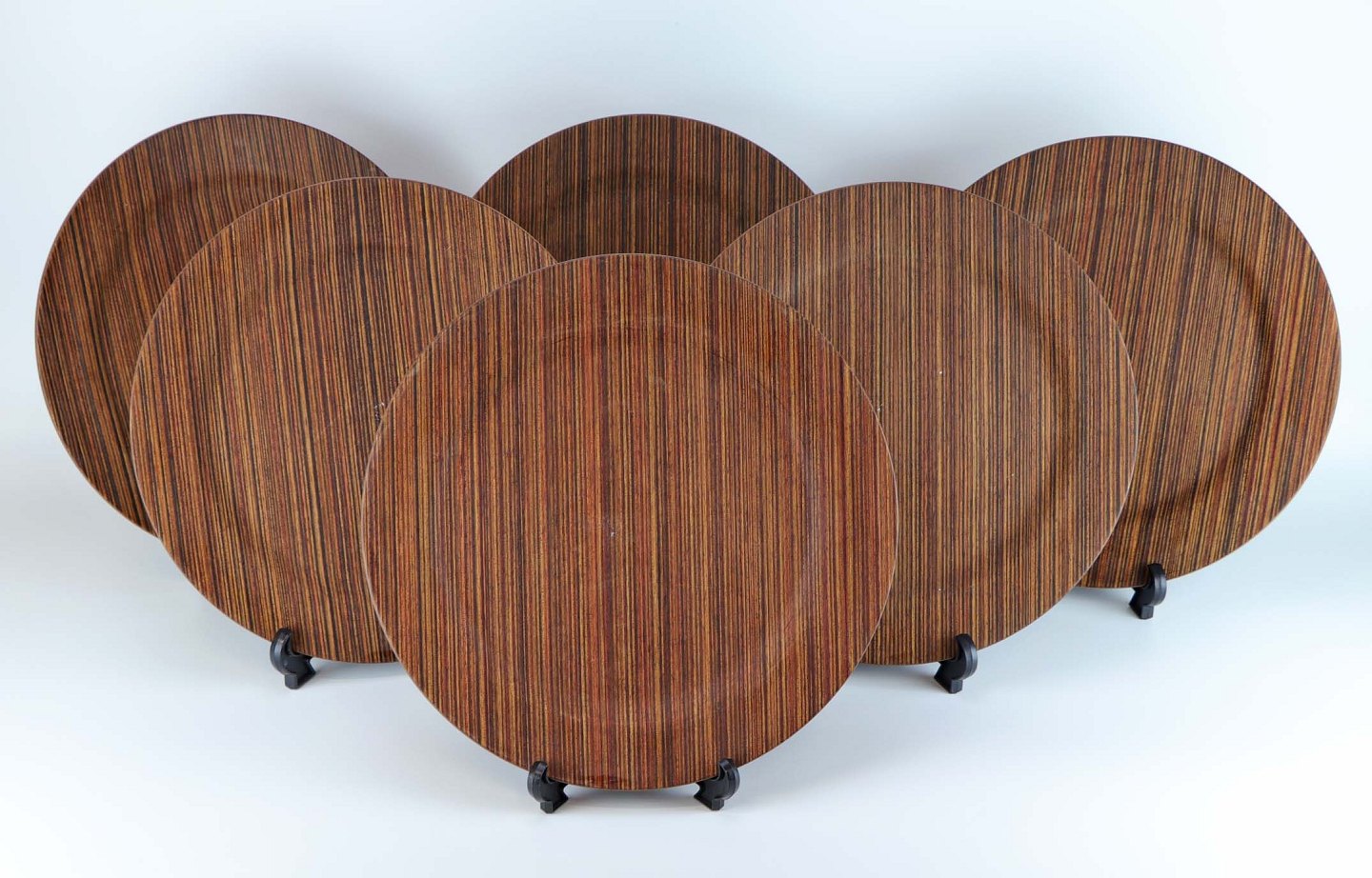 Et sæt med seks styk dækketallerkner i træ med stribet mønster i forskellige nuancer