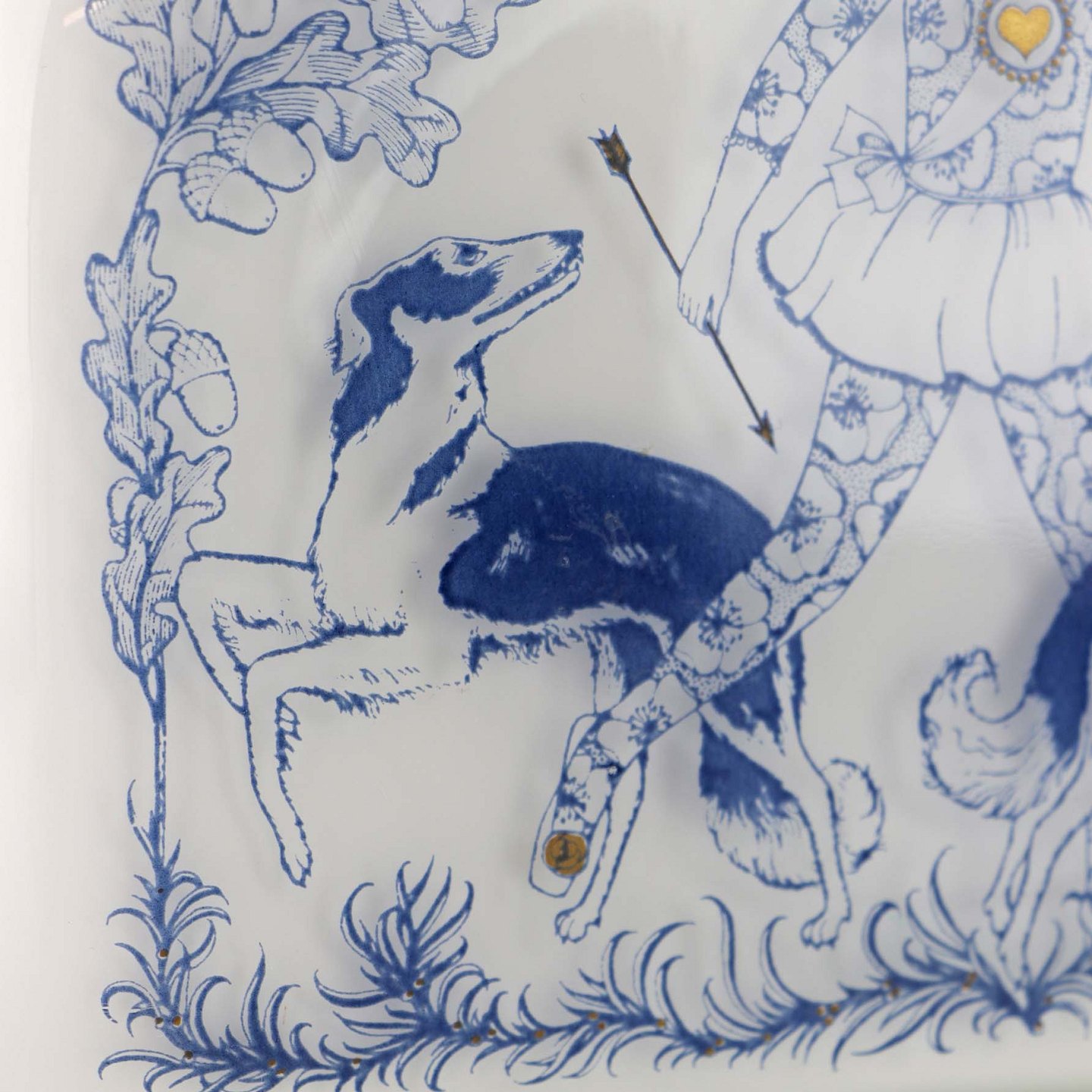 Karaffel i opalhvidt glas med klar overfangsglas fra år 1970 samt med motiv af jægerinde med to Borzoi hunde fra mynderacen i blå og gylden streg