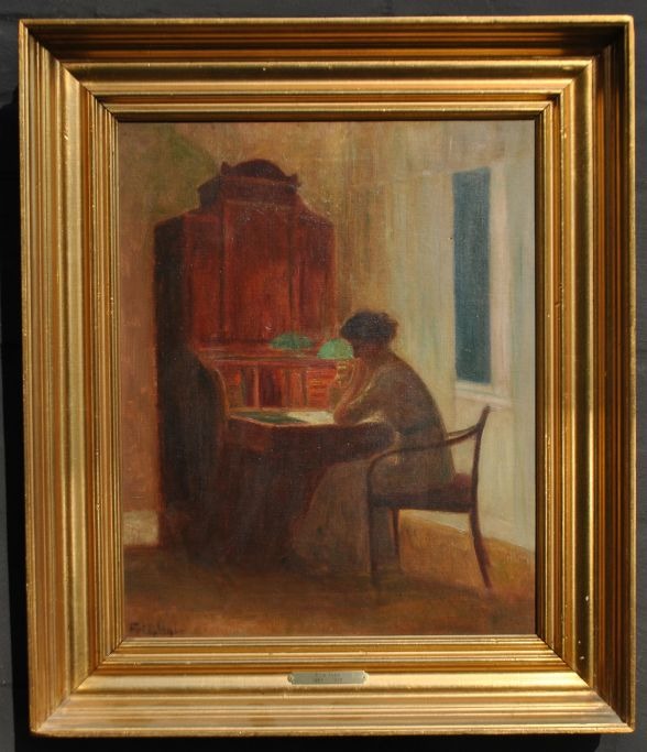 Friis Nybo, Poul (1869 - 1929) Danmark: En læsende kvinde ved et chatol. Olie på lærred. Signeret. 42 x 34 cm.