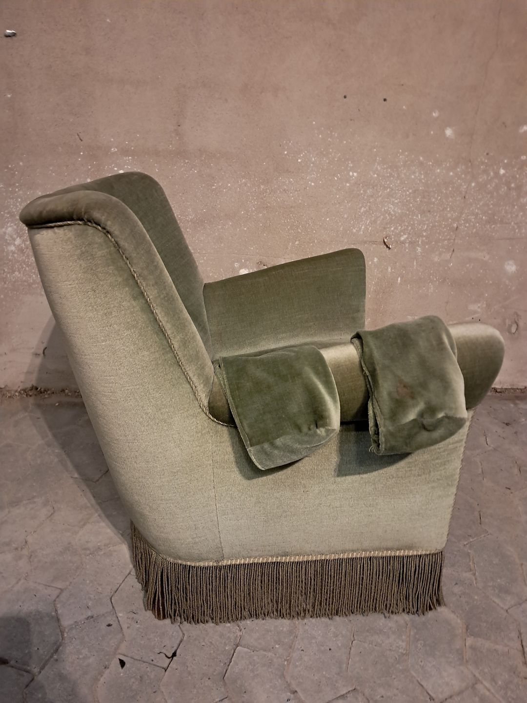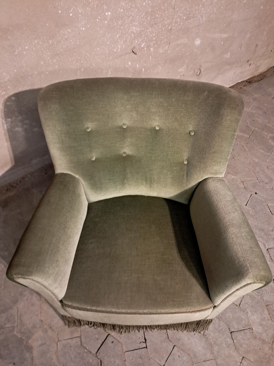 Lænestol i velour med skåneærmer, fra 1950erne.