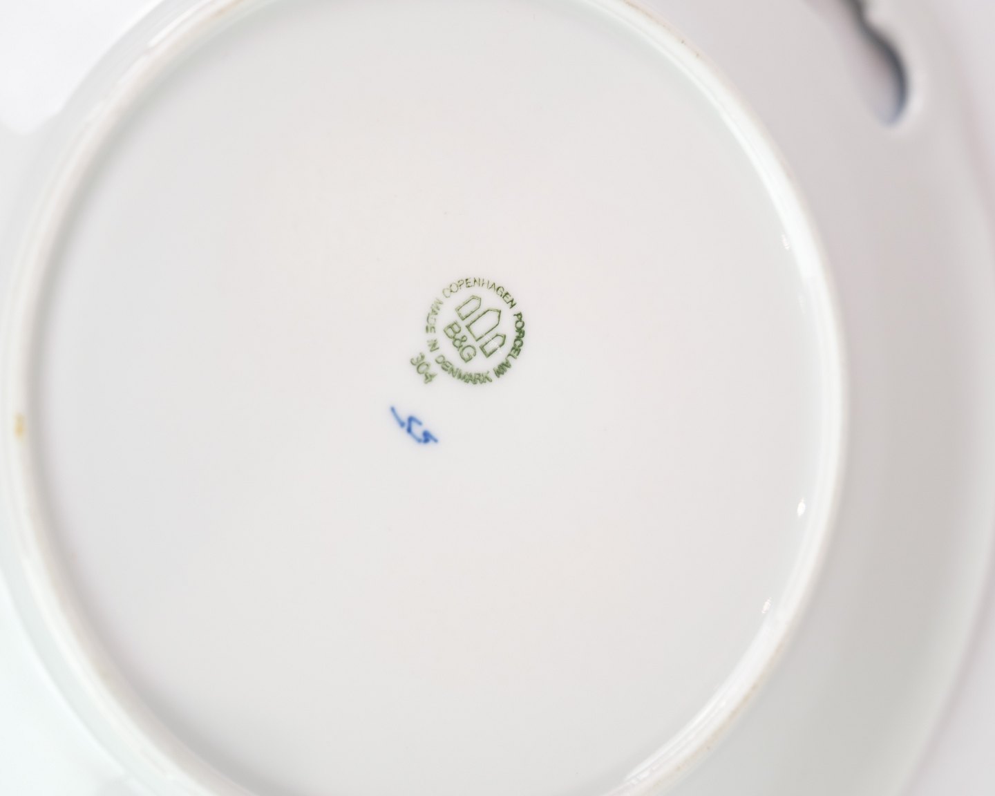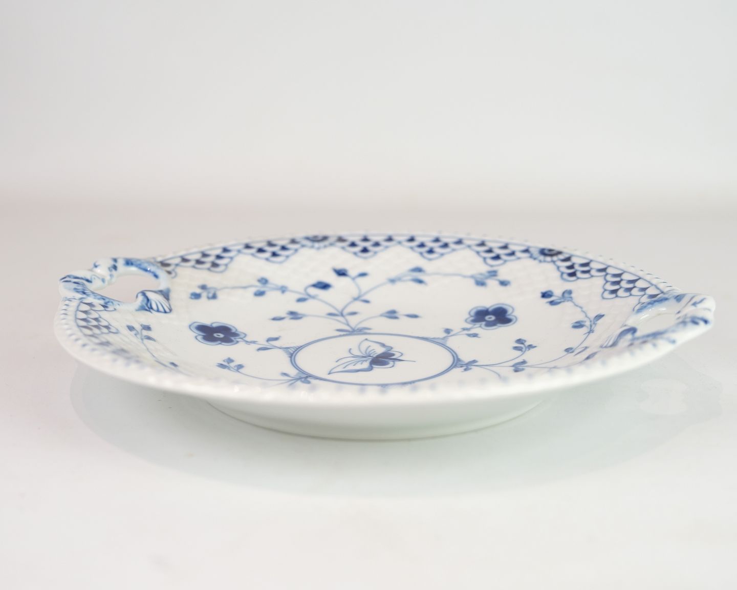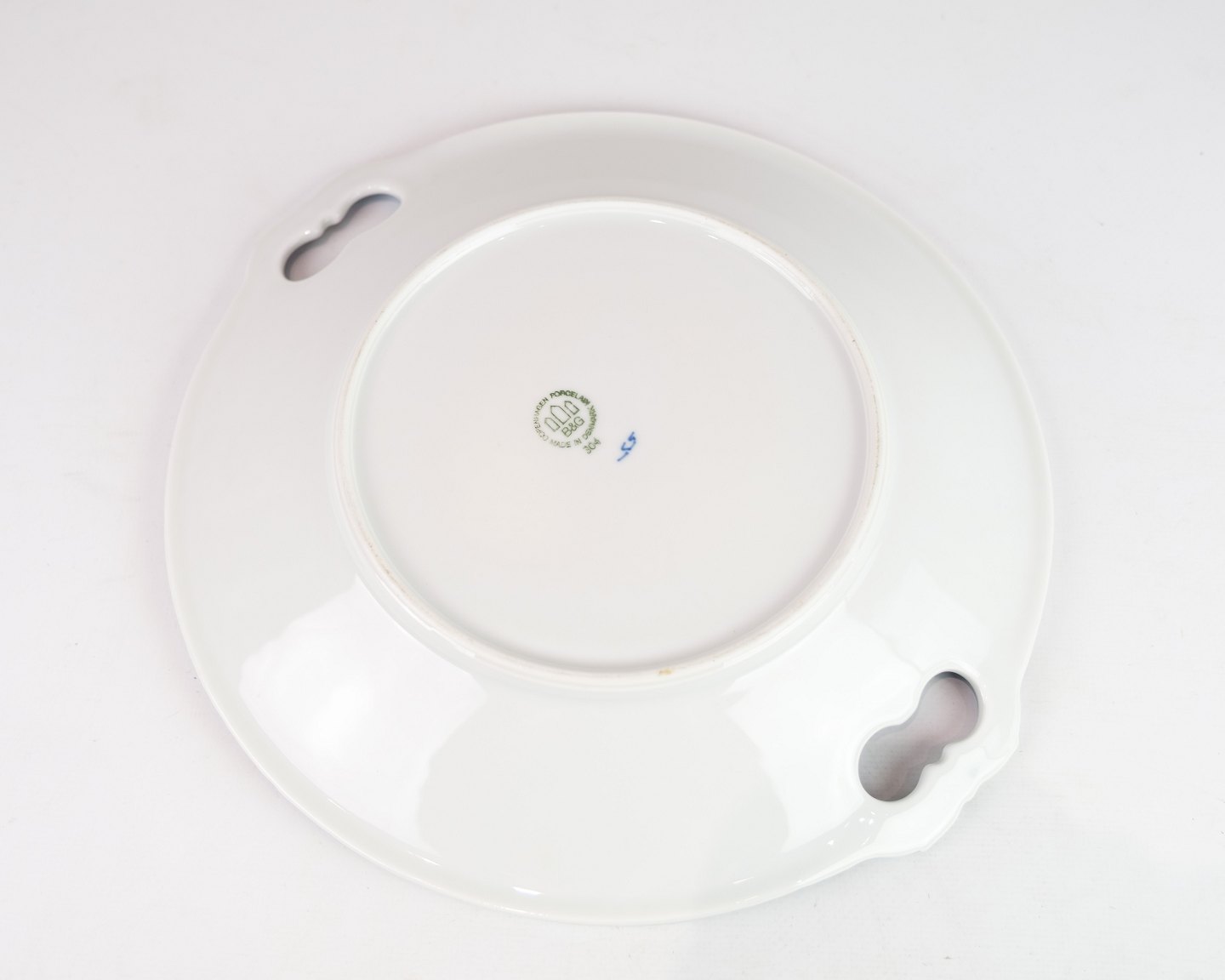 Rundt kagefad med hanke, model nr. 304, fra Bing & Grøndahl. Dekoreret med Sommerfugl-motiv. Porcelæn med trykt stempel under bunden. Egnet til servering eller samling.