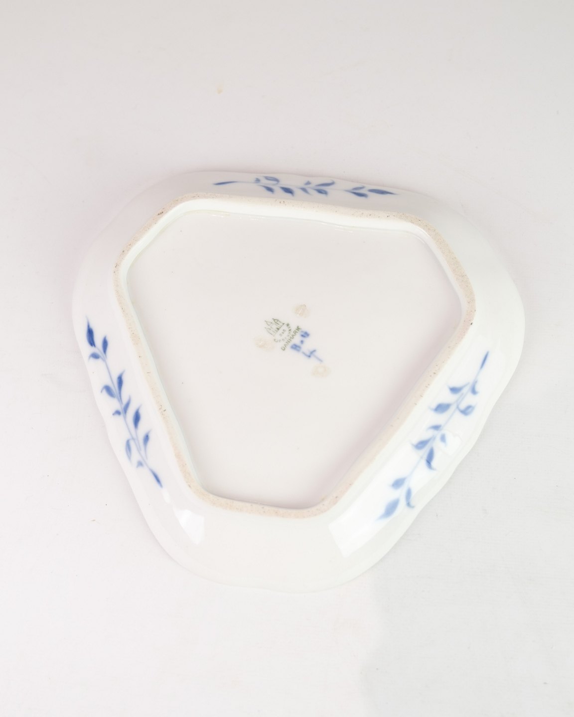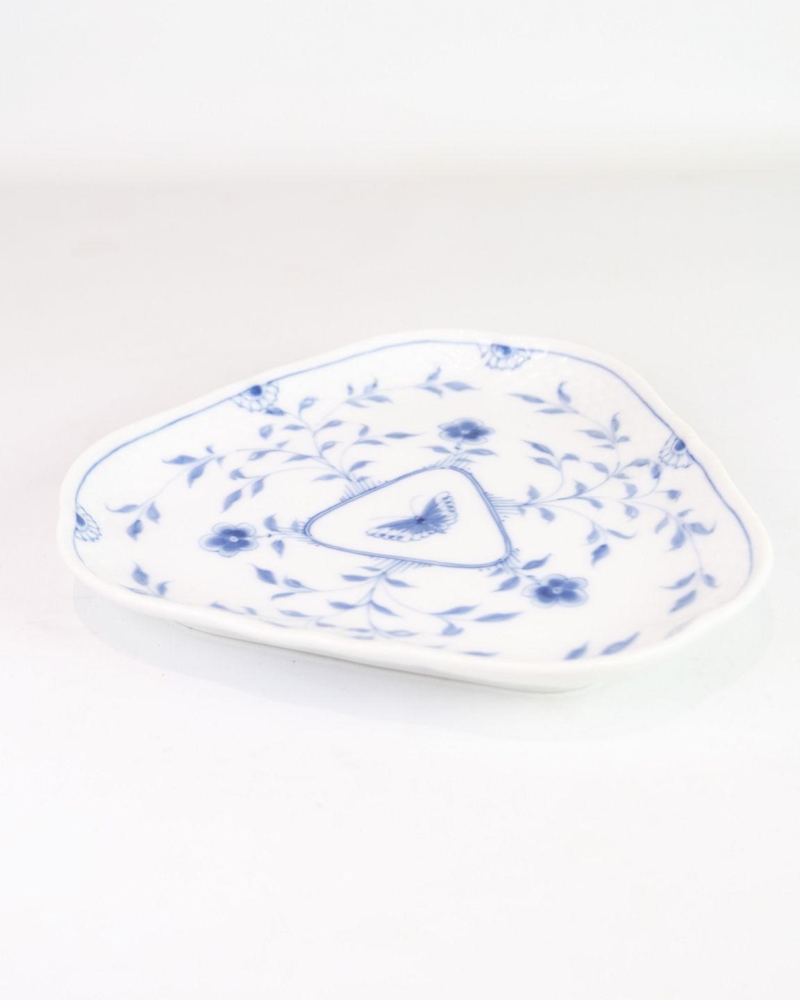 Trekantet fad nr. 4 fra Bing & Grøndahl. Udført i porcelæn med håndmalet sommerfuglmotiv. Unik form, velegnet til servering eller som dekorativt element. Stemplet under bunden.