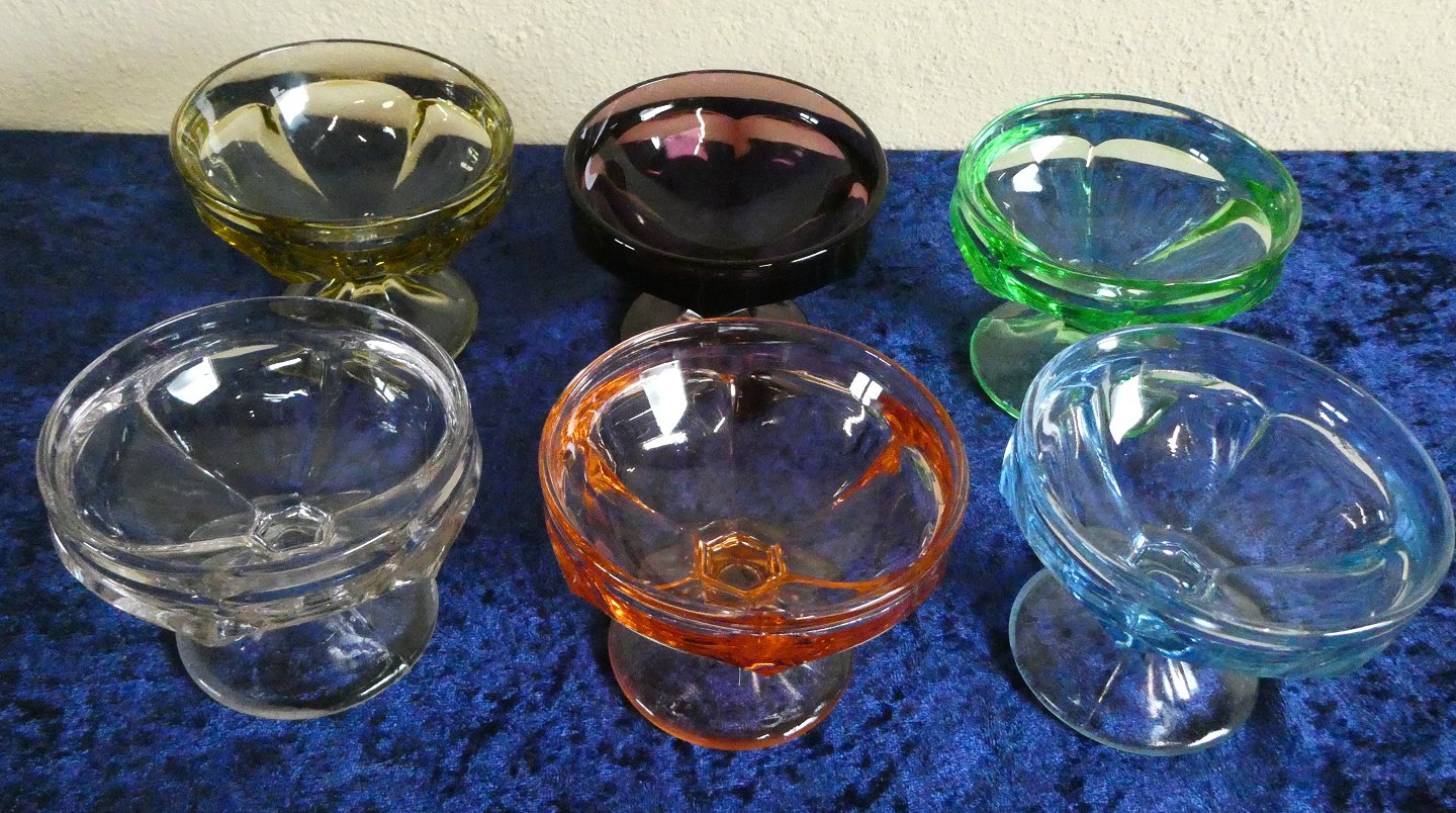 Portionsglas i presset, farvet glas. Sæt på 6 glas fra Sverige.