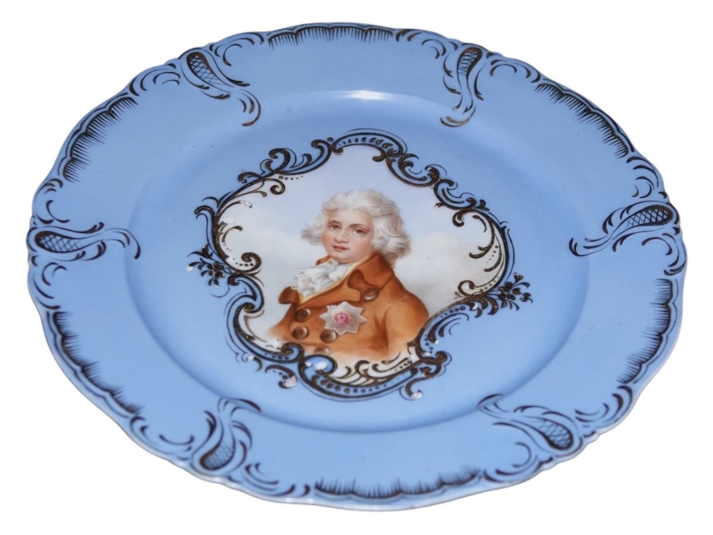 Royal Copenhagen blue plate with gold decoration and decorated with a noble man. This is from around 1800 to 1830.