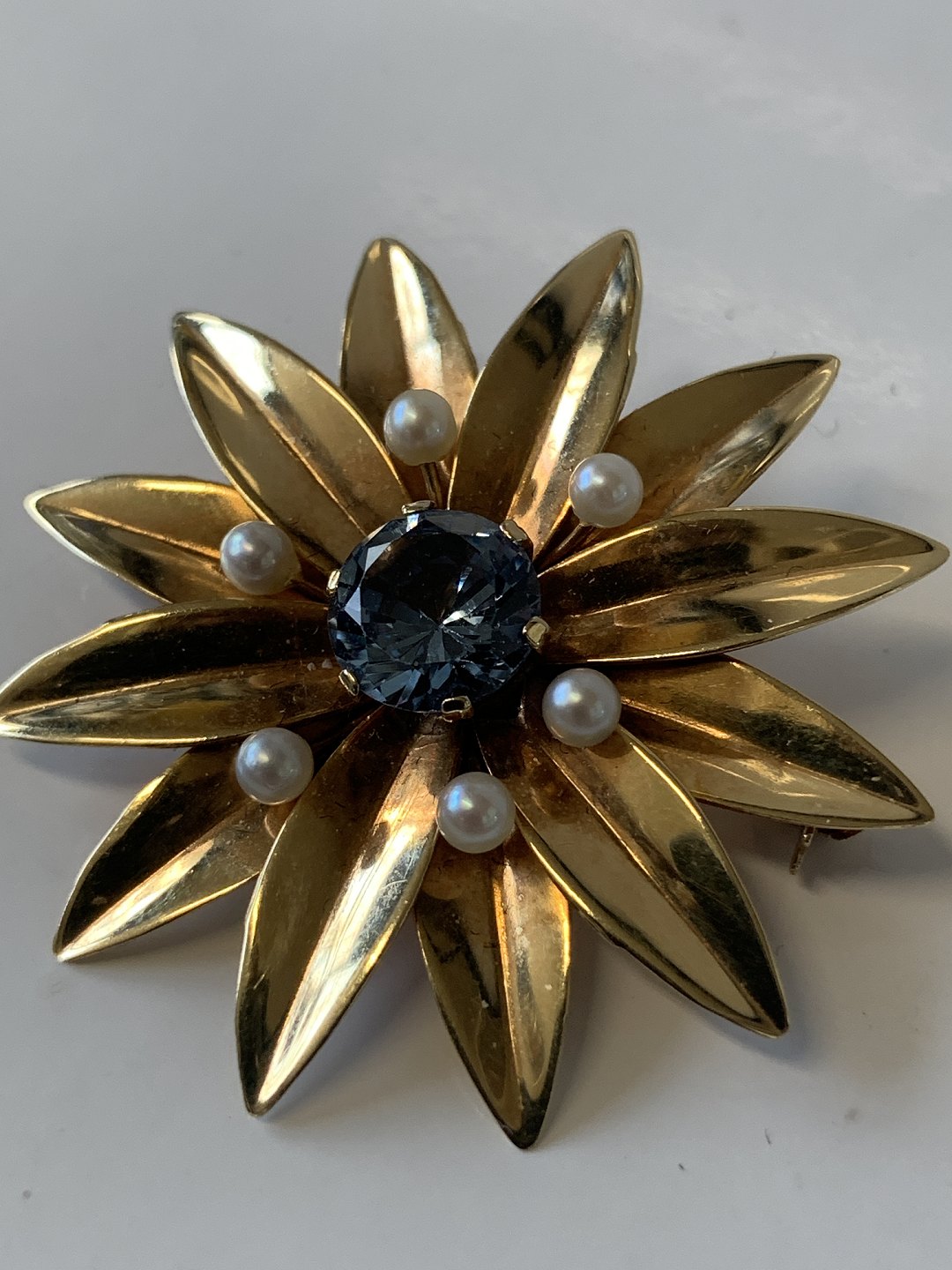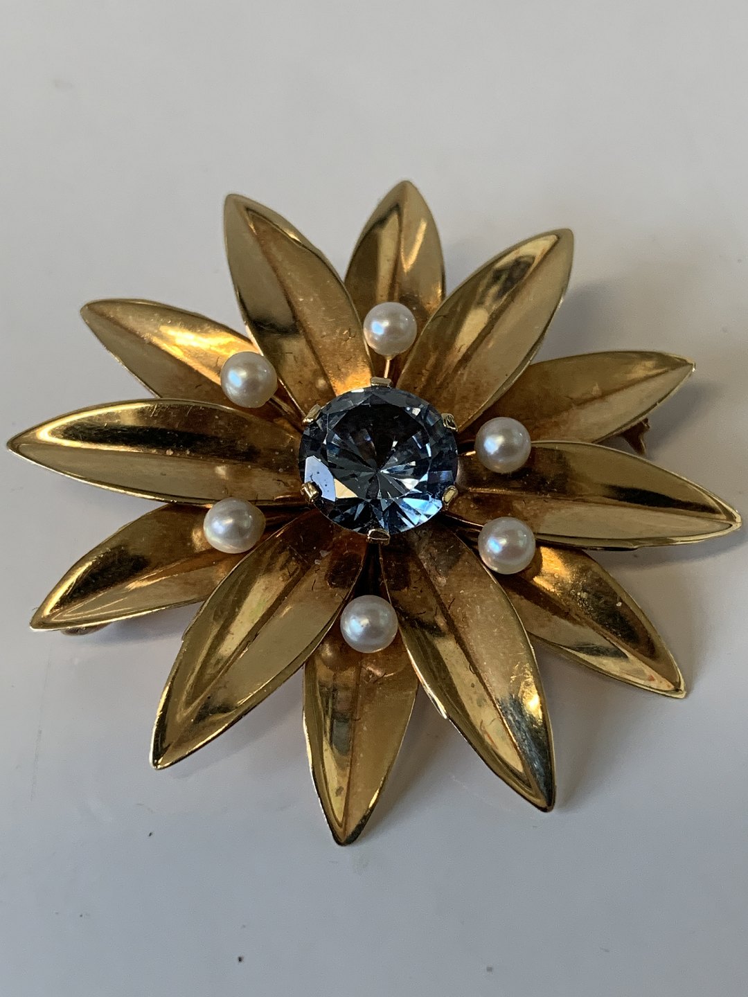 14 Karat guld broche med blå sten og perler