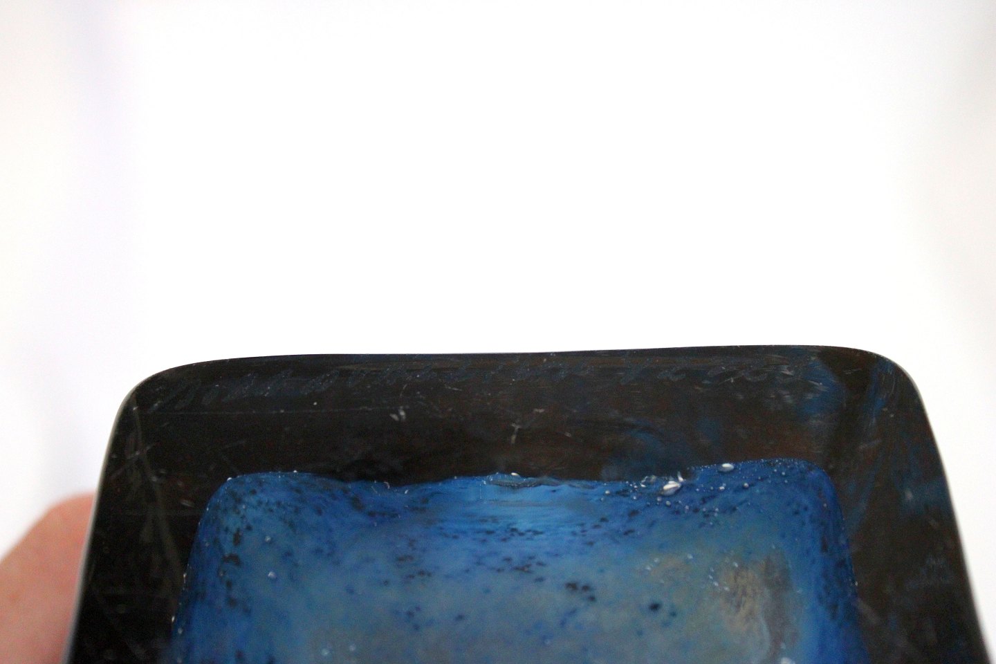 Kosta Boda, Firkantet vase i blå og brune farver. Designet af Bertil Vallien i slutningen af 1970'erne. Vasen er fra Boda, som er en del af Kosta Boda og Åfors glasbruk. Signeret "Boda bvallien 42723". Højde 22 cm. 7,5 x 7,5 cm. Flot stand. Pris: 575 kr.