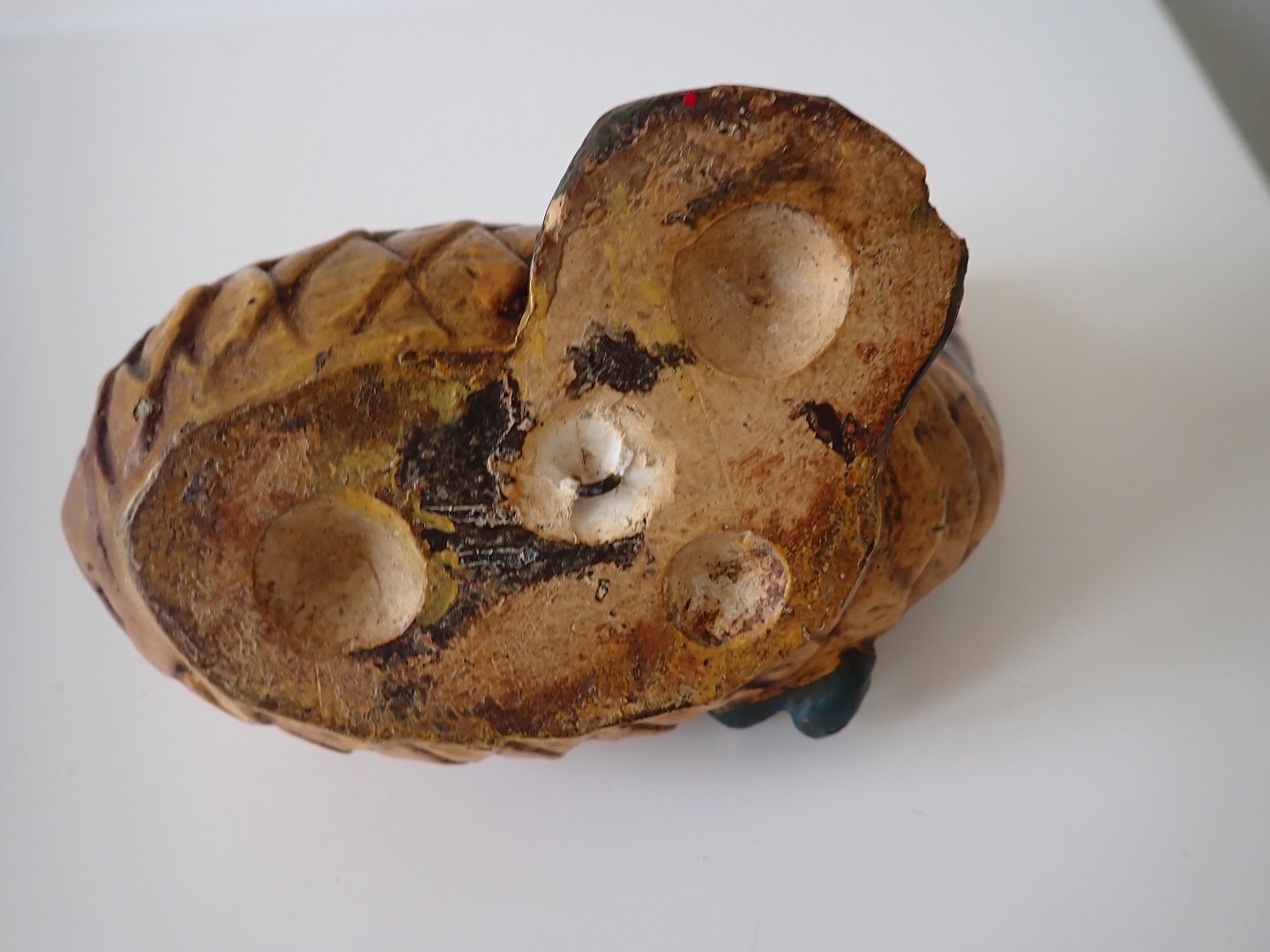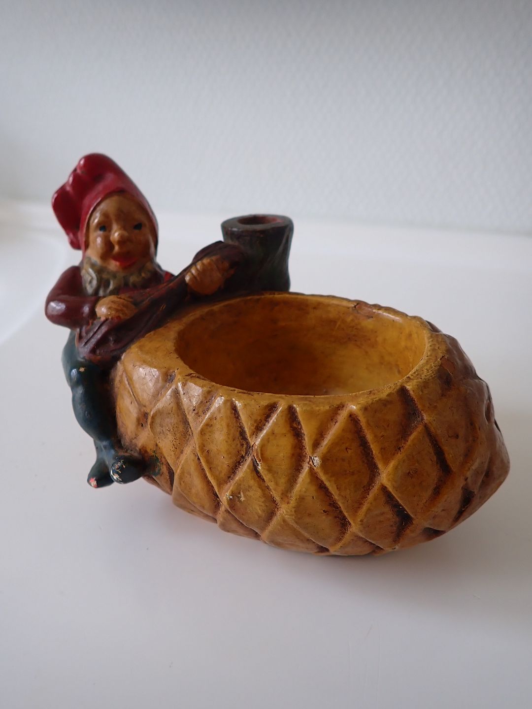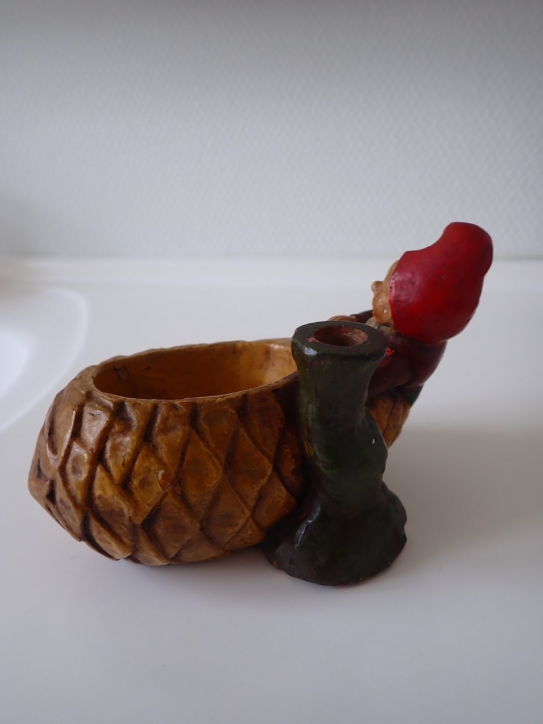 Håndmalet gipsnisse der spiller på mandolin ved en kurv med lyseholder. Tysk. Ca. 1940. Højde: 10 cm. Bredde: 12,5 cm. I fin stand i forhold til alder.