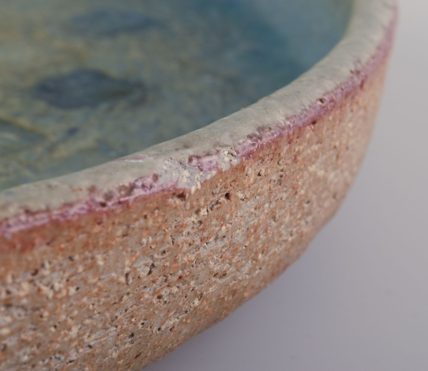 Eva Stæhr-Nielsen (1911-1976) for Saxbo. Stort fad af stentøj, dekoreret med blå og grøn glasur.