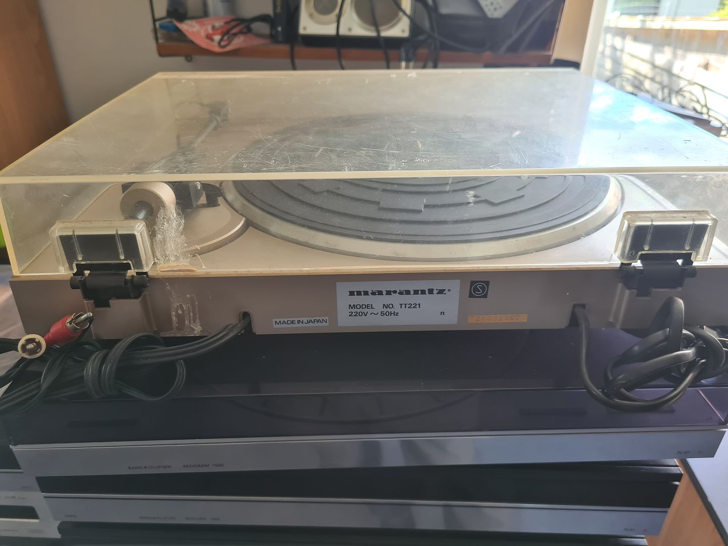 Pladespiller fra Marantz model TT 221. Nok mest til reservedele eller restaurering. Motoren kører og skiven drejer. Armen mangler modvægt. Fremstår med brugsspor. (Billede)