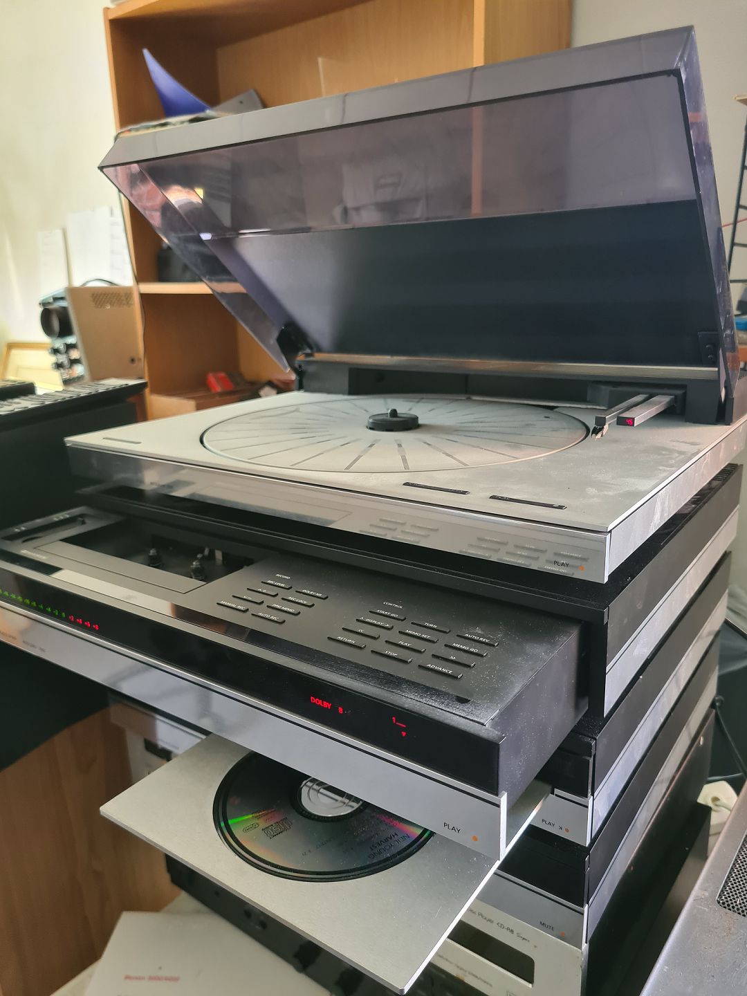 B&O anlæg fra 7000 serien i sølv/sort. Delvist til restaurering/reservedele. Beomaster 7000 virker fint. Beomaster CD virker fint. Beocord lyser og skuffen virker, men ikke funktionerne vedrørende afspilning af kasettebånd. Beogram pick-up armen flytter sig ikke, og skiven drejer heller ikke. Ældre fjernbetjening medfølger.