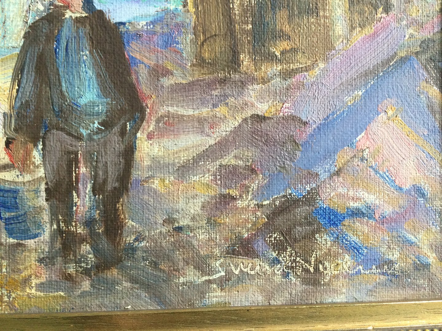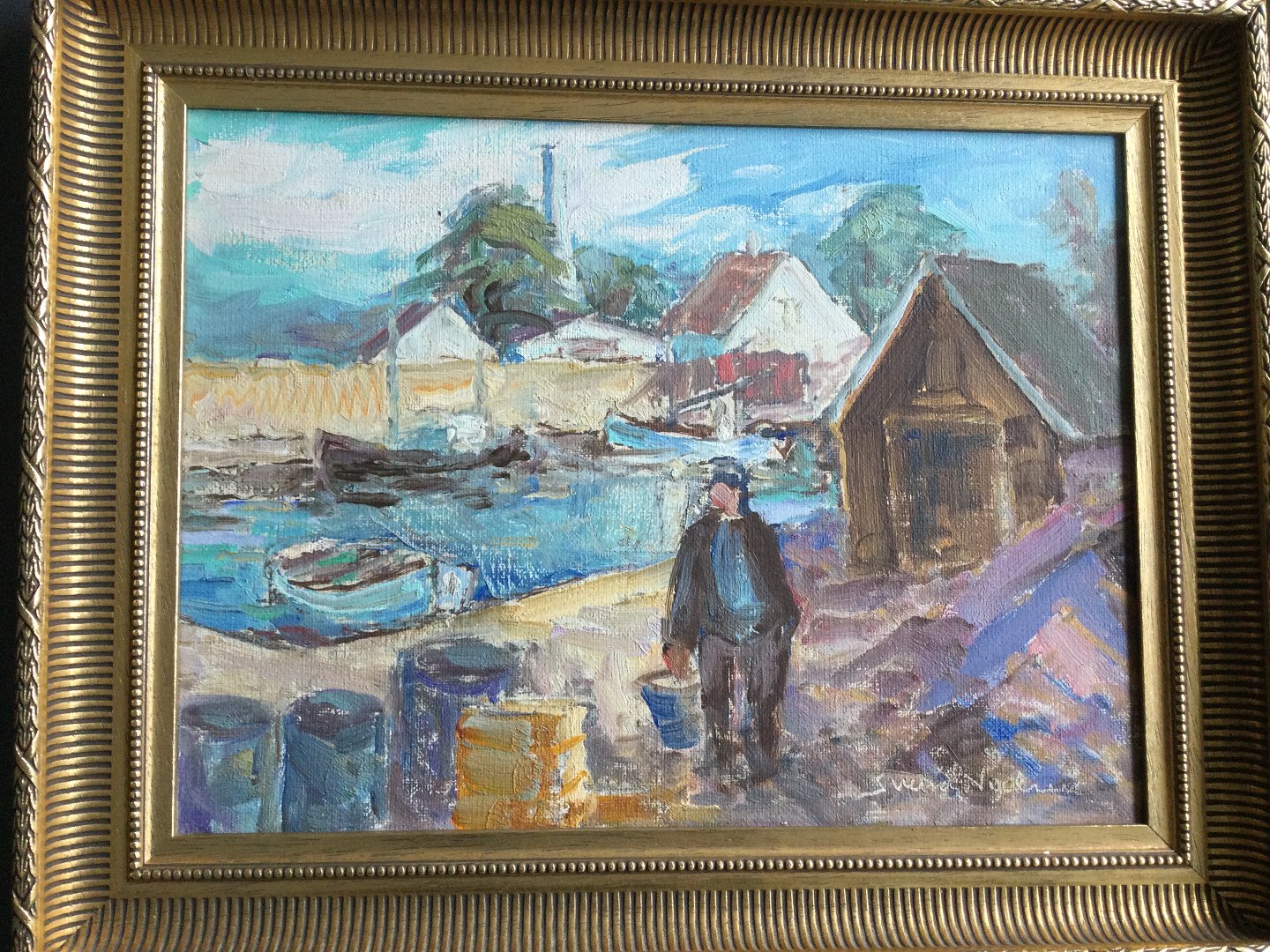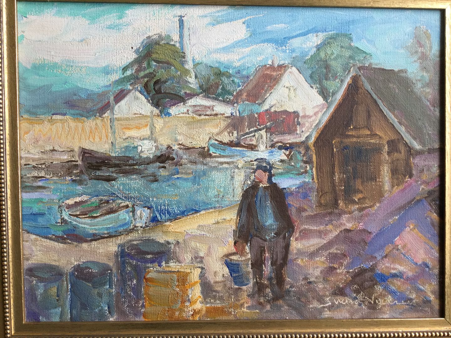 Maleri af Svend Nielsen, Havneparti Sandvig, Bornholm.