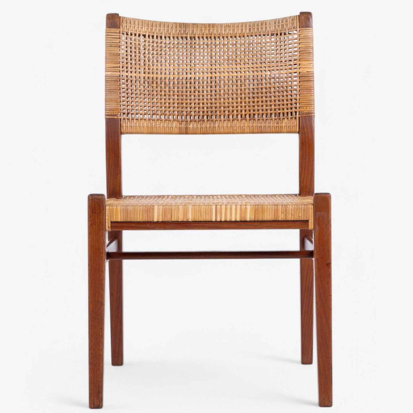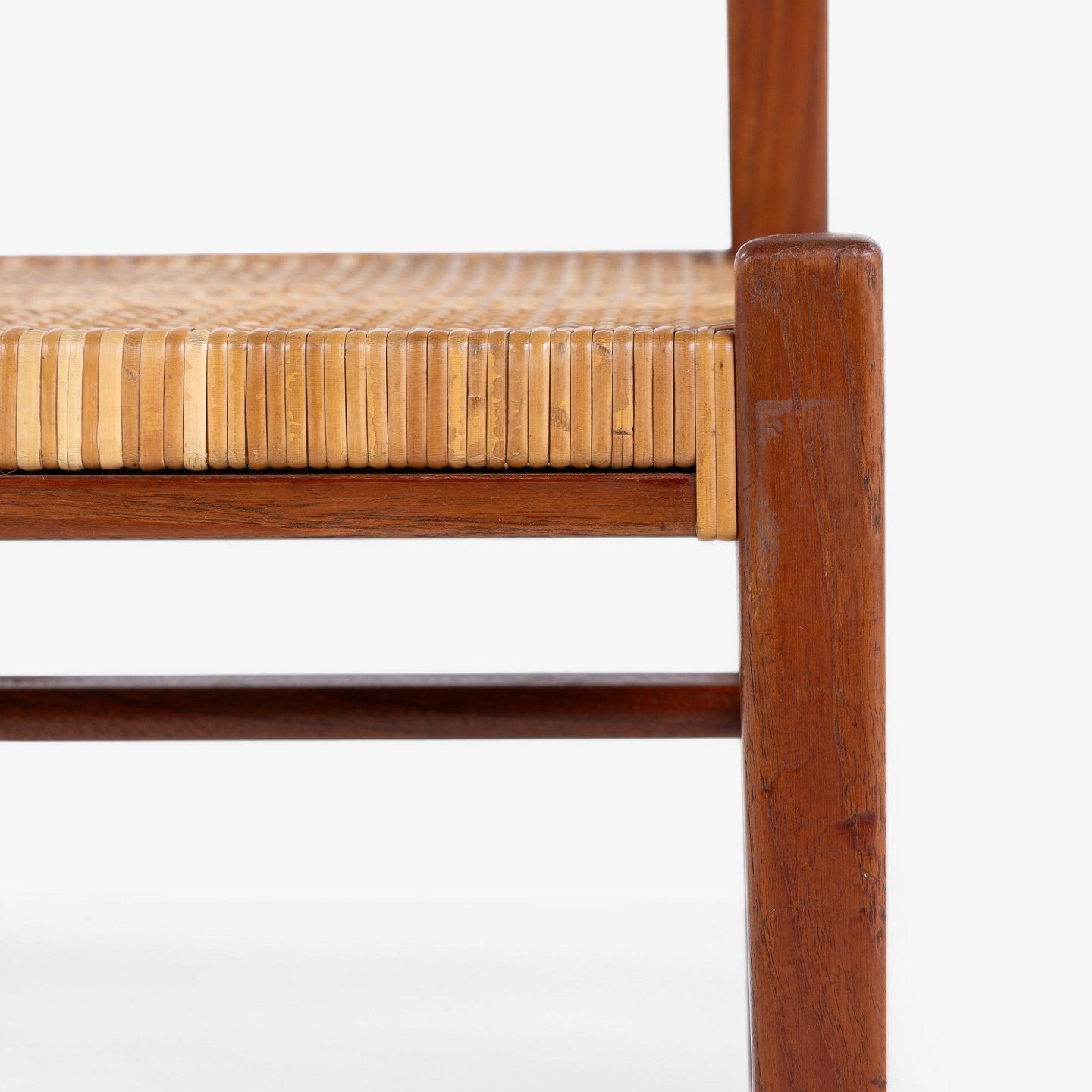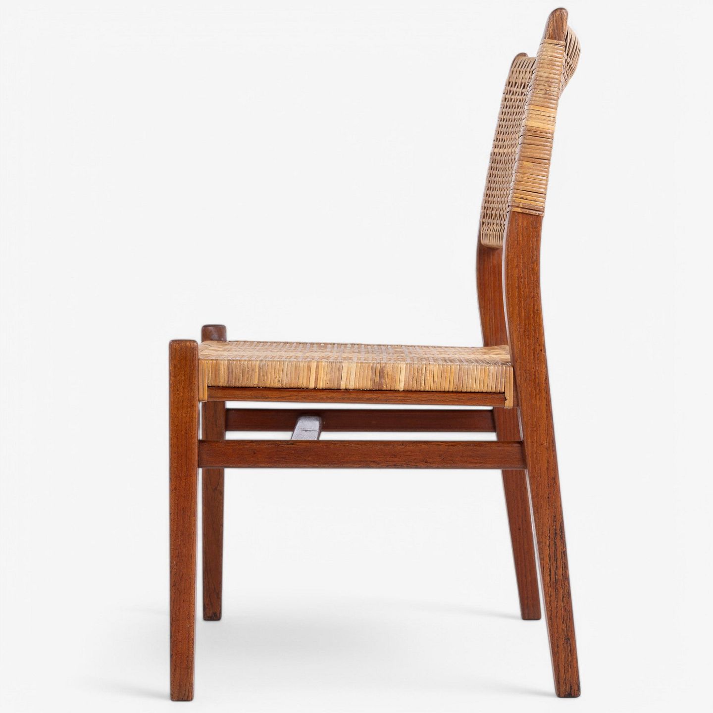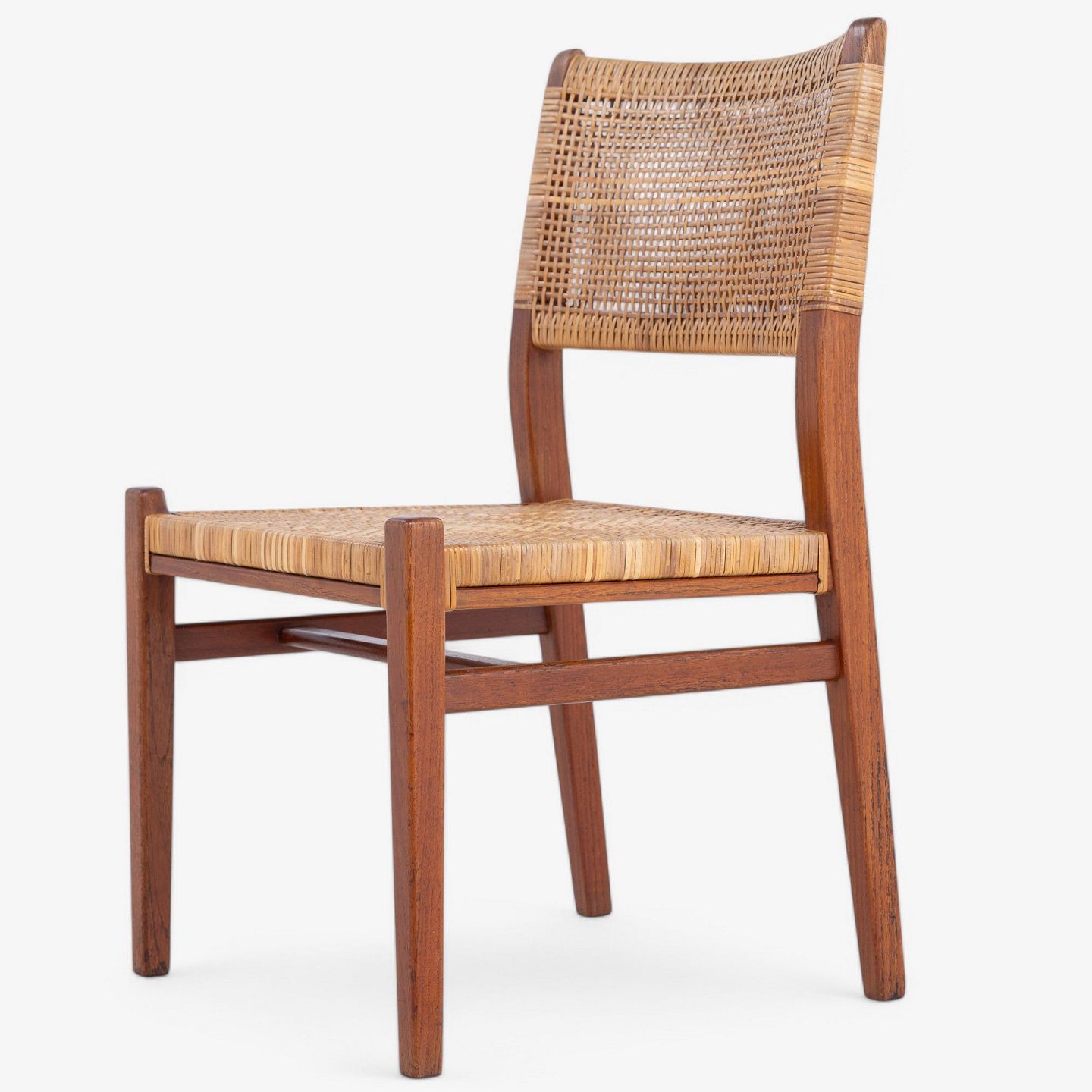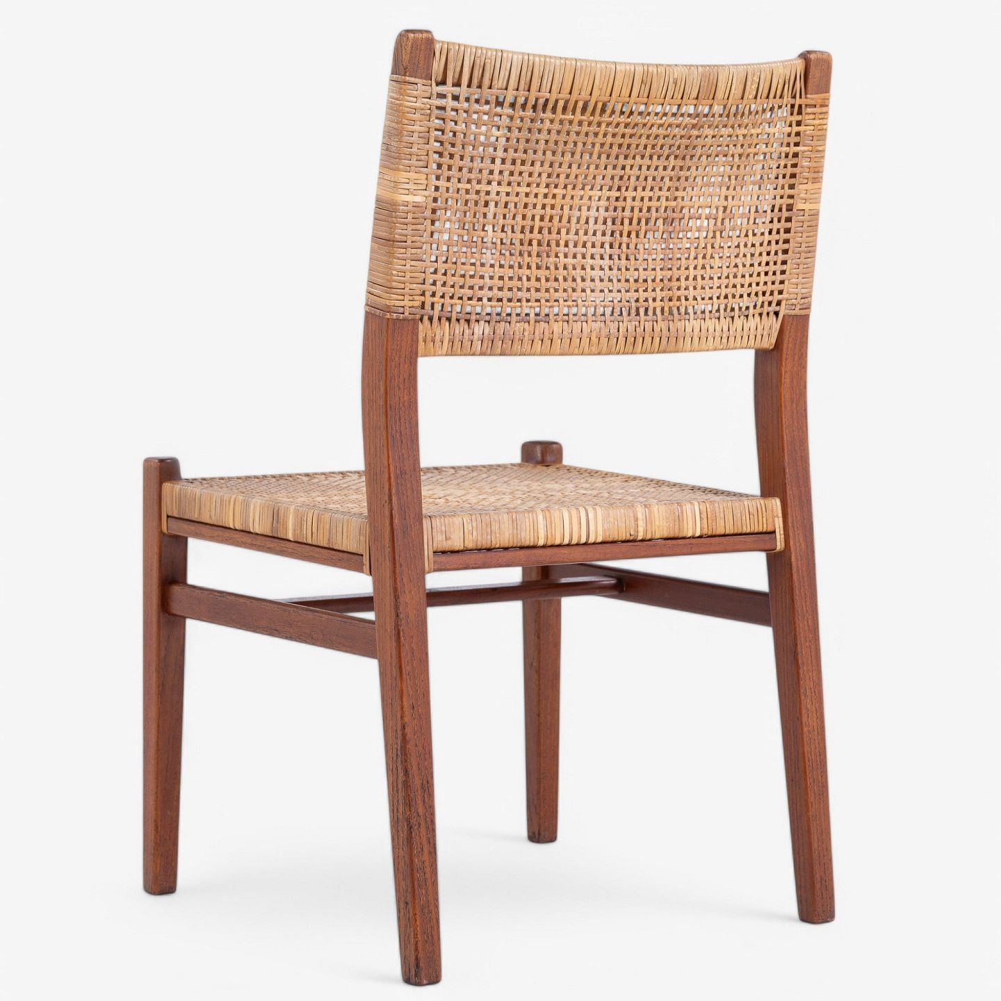 Spisestol i mahogni med sæde og ryg i patineret sjeneflet. Formgivet i 1953.
