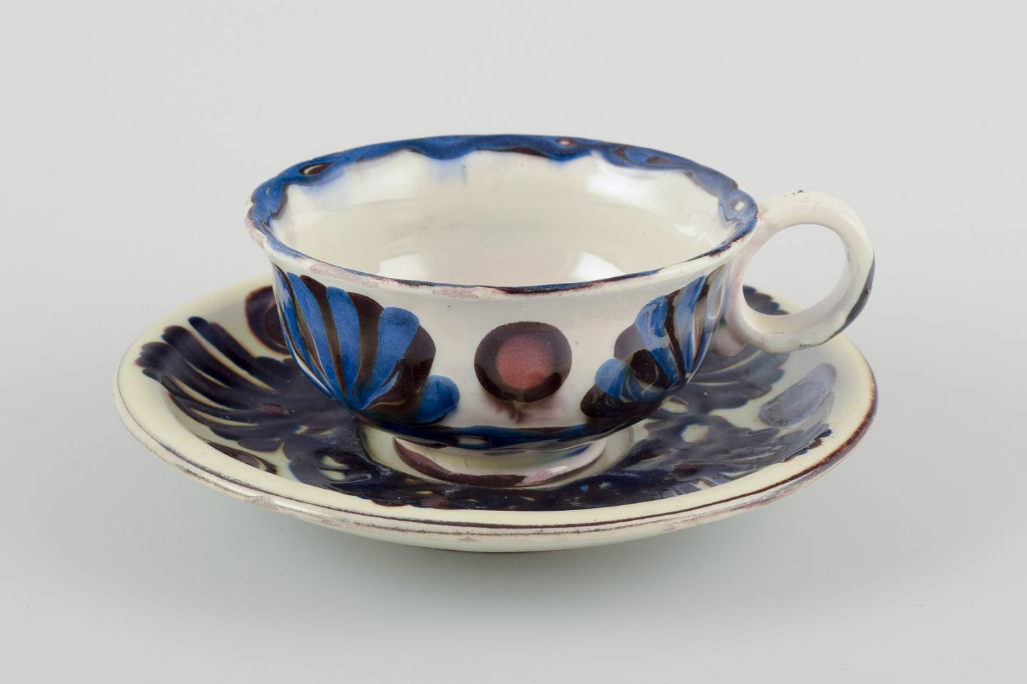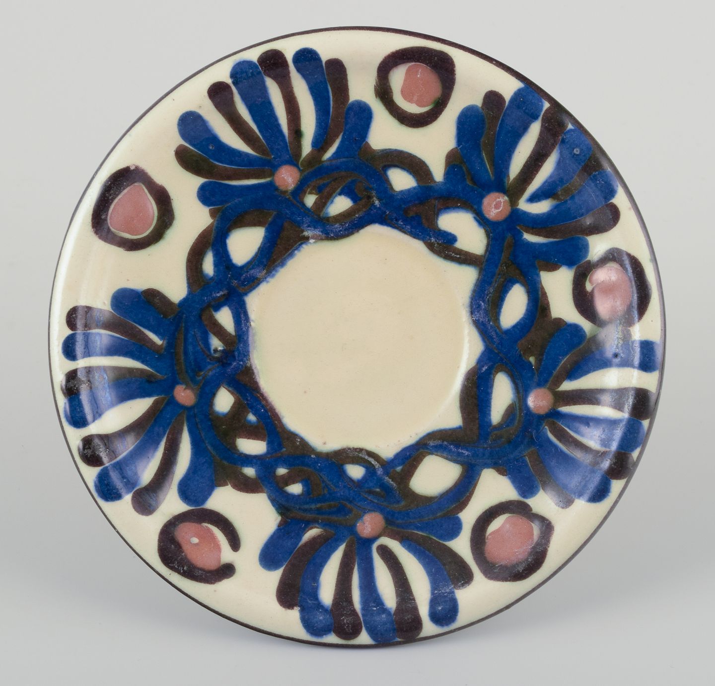 Hånddekoreret i blåt og brunt på cremefarvet bund.
