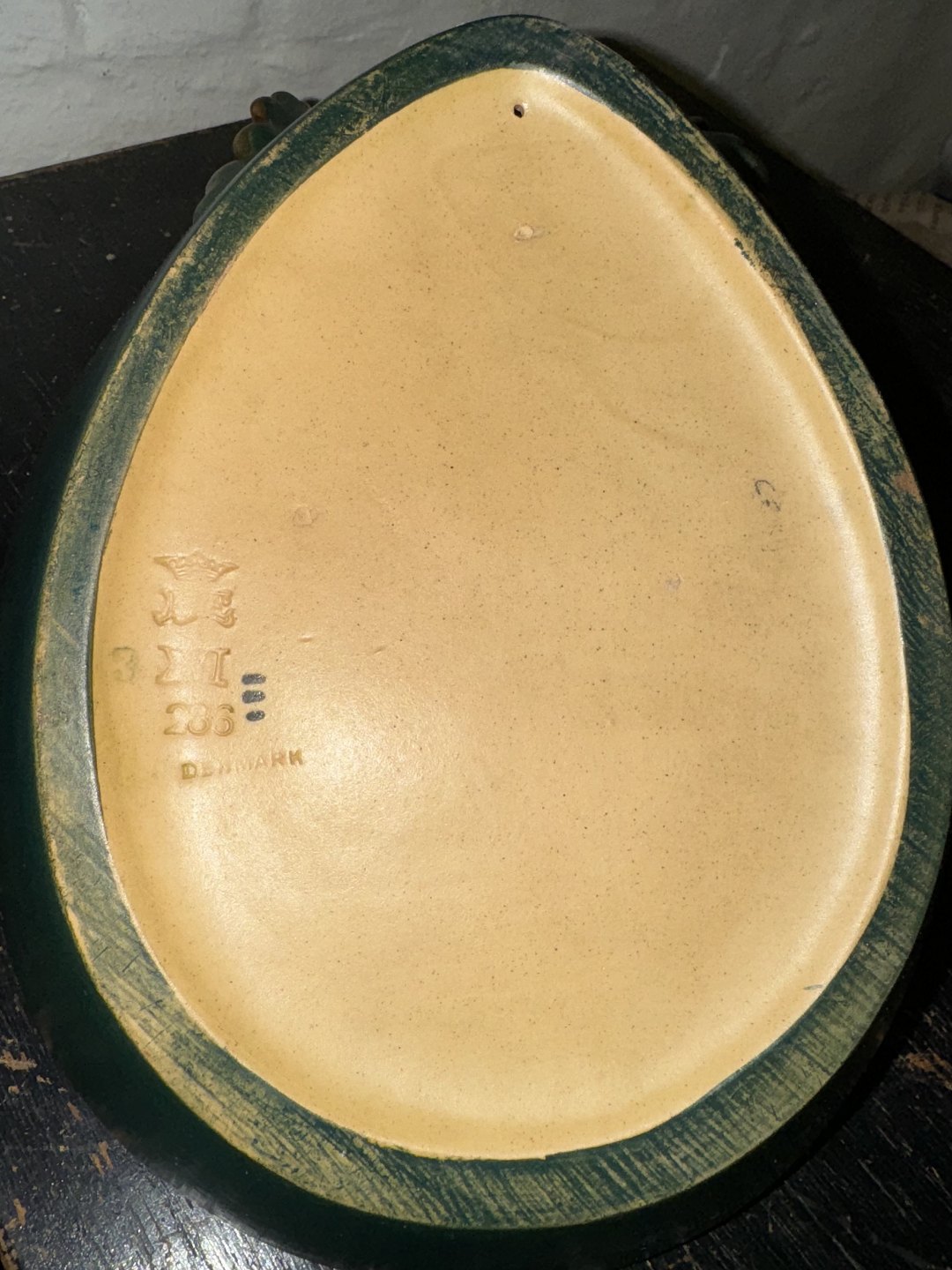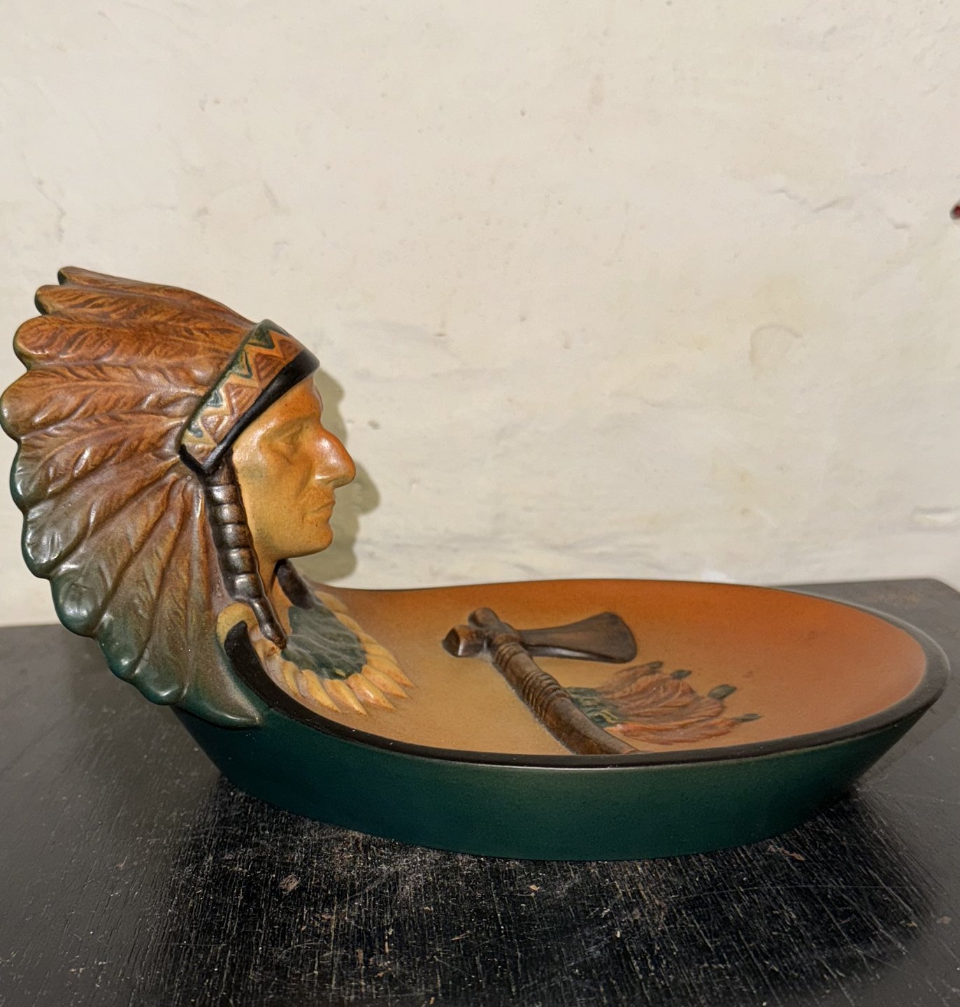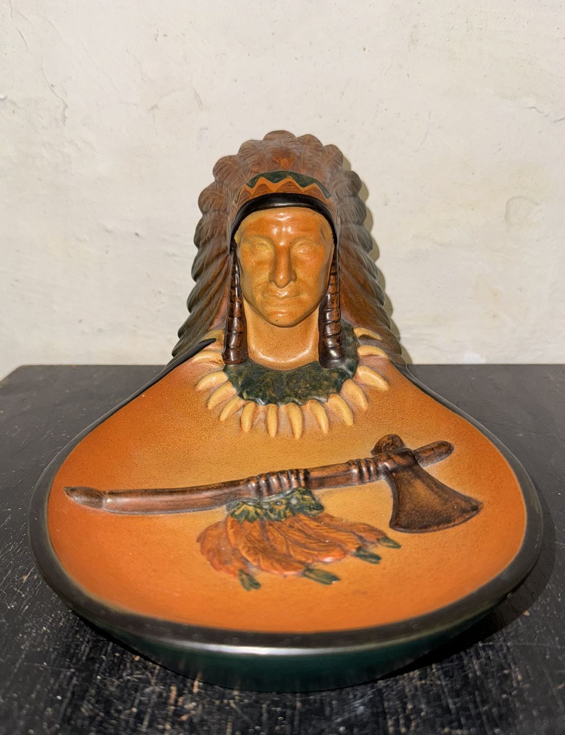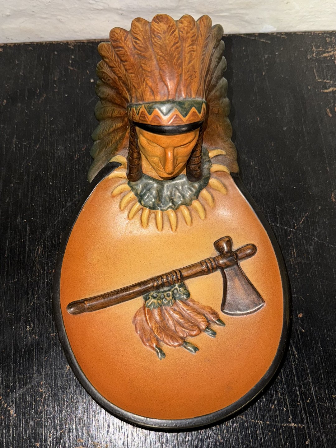 Indianer-høvding for enden af lavt keramik fad fra P. Ipsens Enke. Fremstår i perfekt stand. Uden skader eller reparationer. Fabriksmærket på bunden sammen med modelnummer 286. Mål: H. 14,2 cm L. 25 cm B. 16,5 cm.