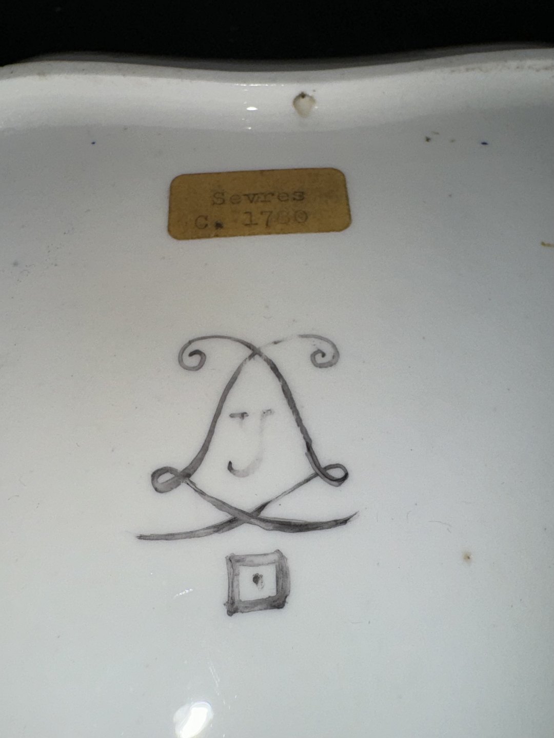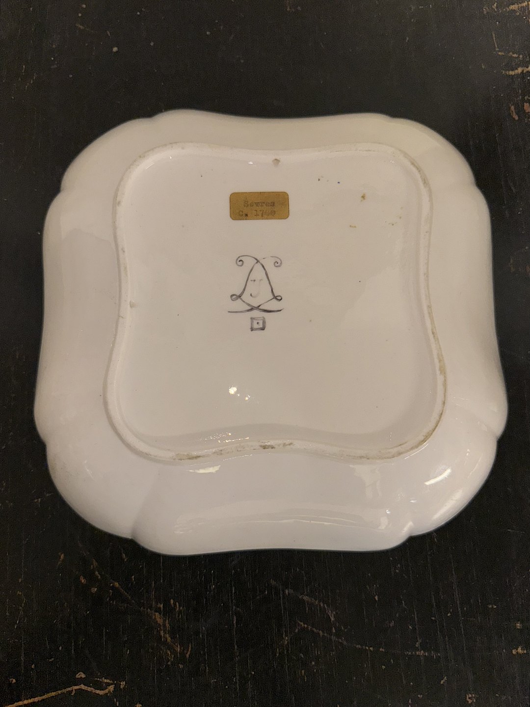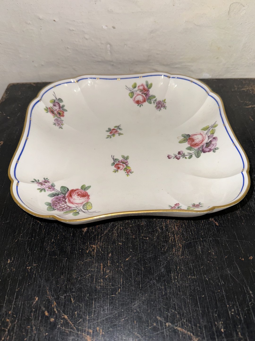 Firkantet fad i porcelæn fra Sèvres, Frankrig. Dekoreret med delikate blomster. Fra slutningen af 18. århundrede. Fremstår i god stand uden skader eller reparationer. Mål:H. 3,5 cm samt 20,7 x 21,3 cm