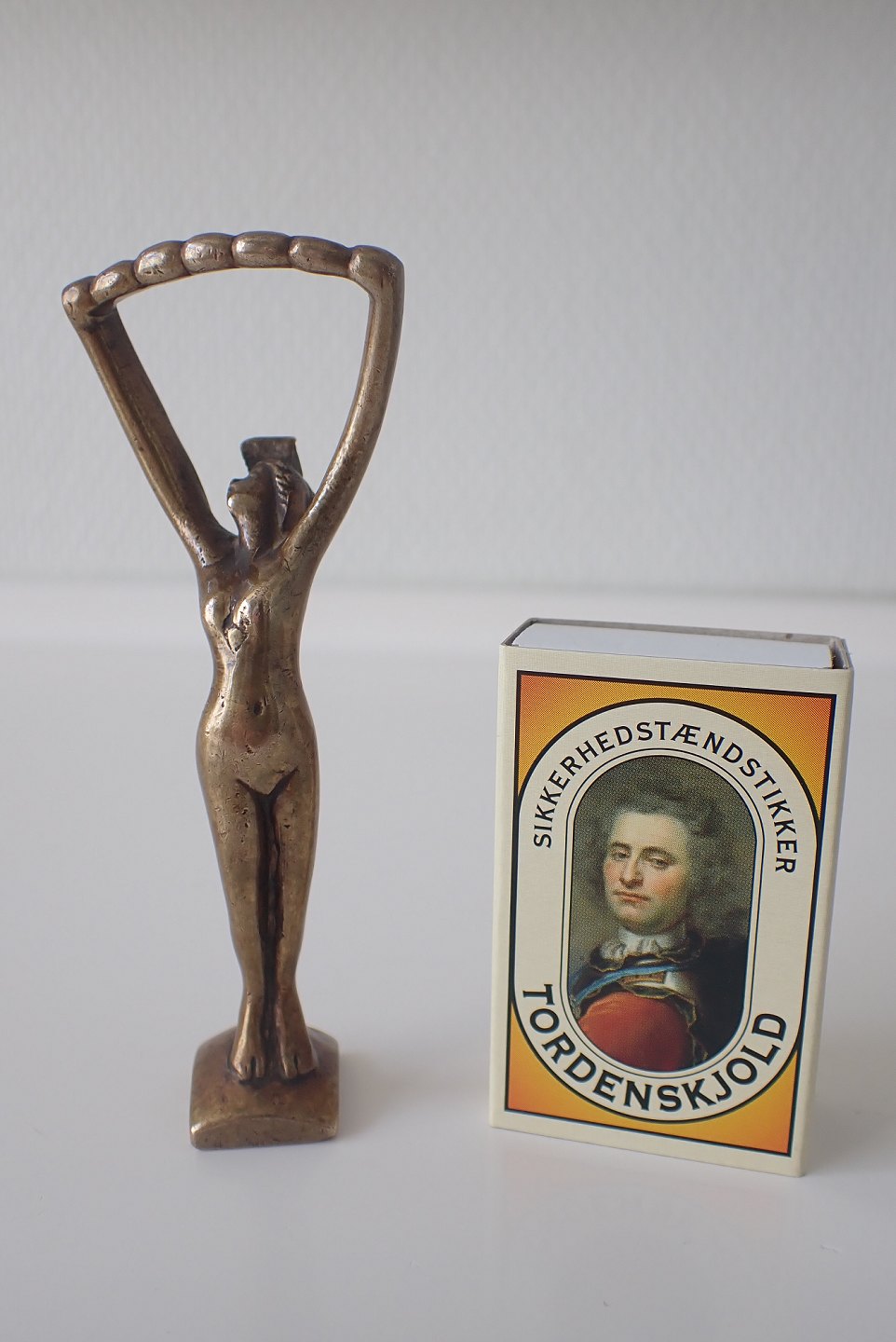Bronzeoplukker i form af en nøgen kvinde. Dansk ca.1930. Højde: 9,7 cm. Vægt: 75,2 gram. I pæn tidstypisk stand.