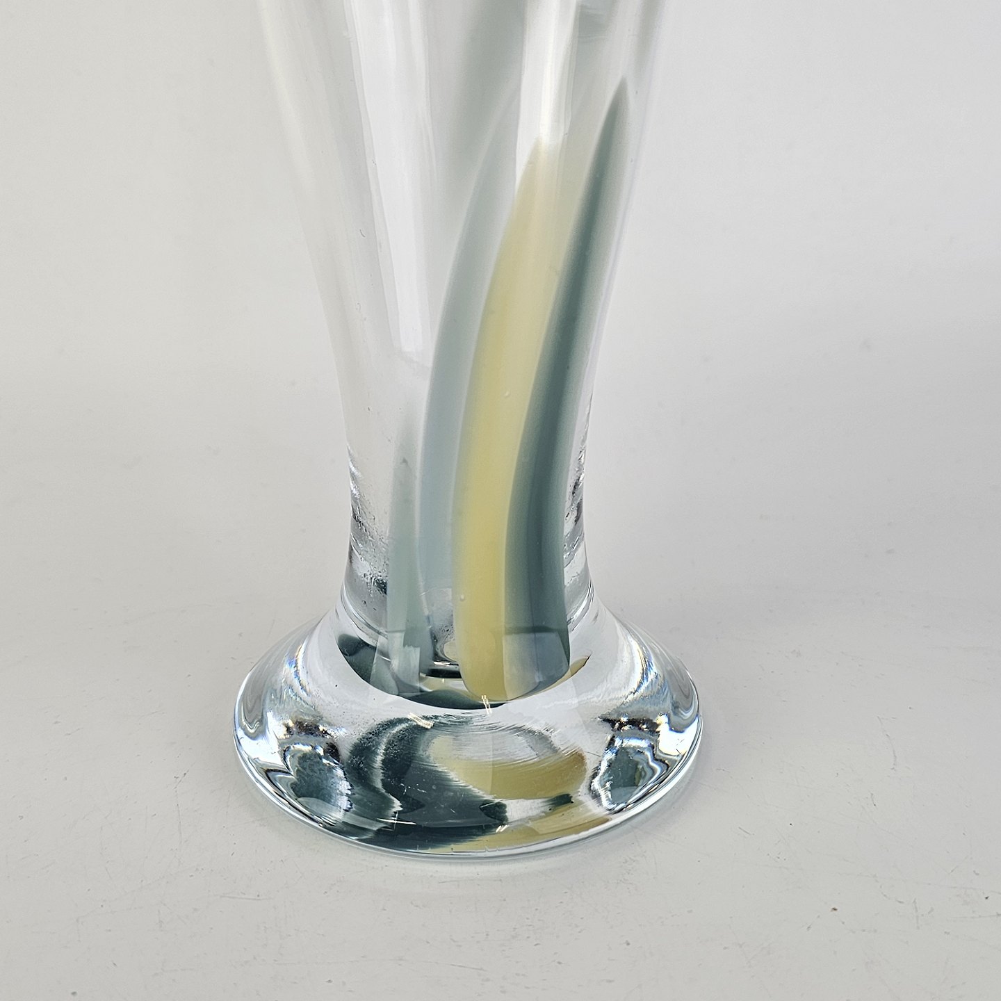 Høj, slank Harmonyvase i klart glas, med gul og blå farve dekoration