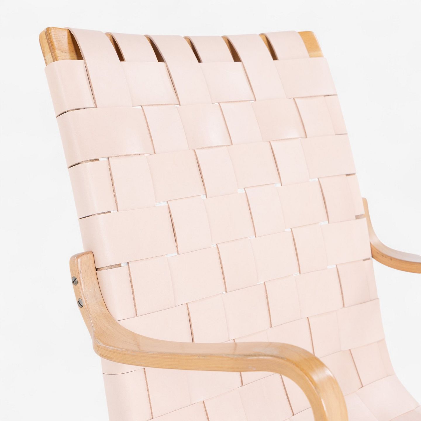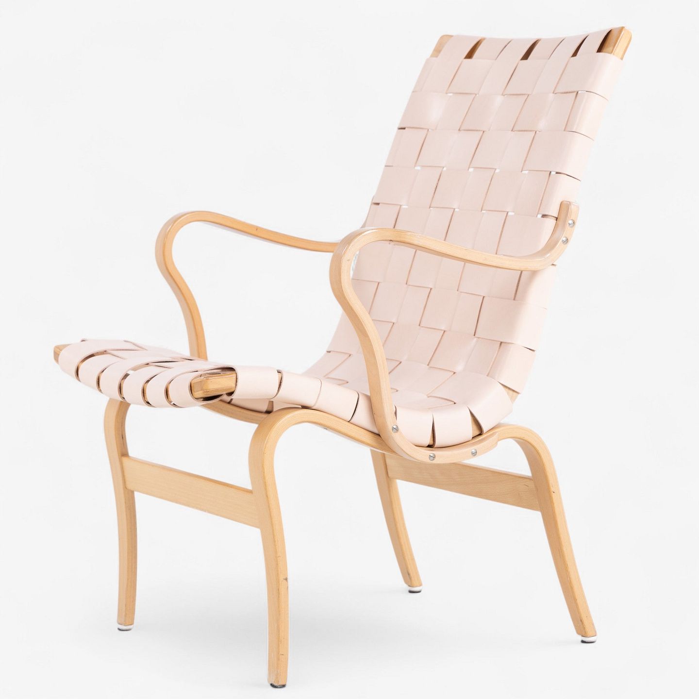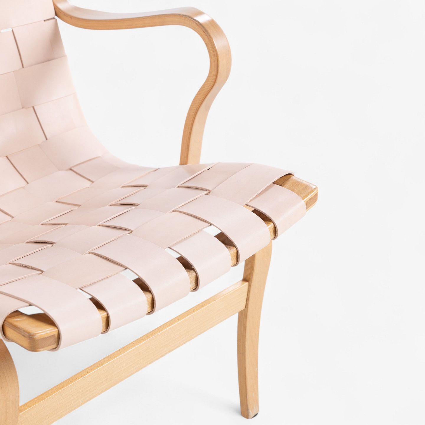 'Eva' armchair in patinated beech with braided natural grain leather. Manufacturer's mark.