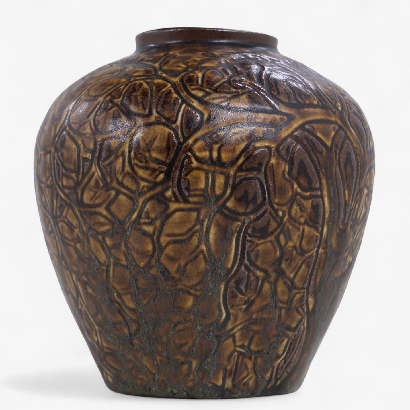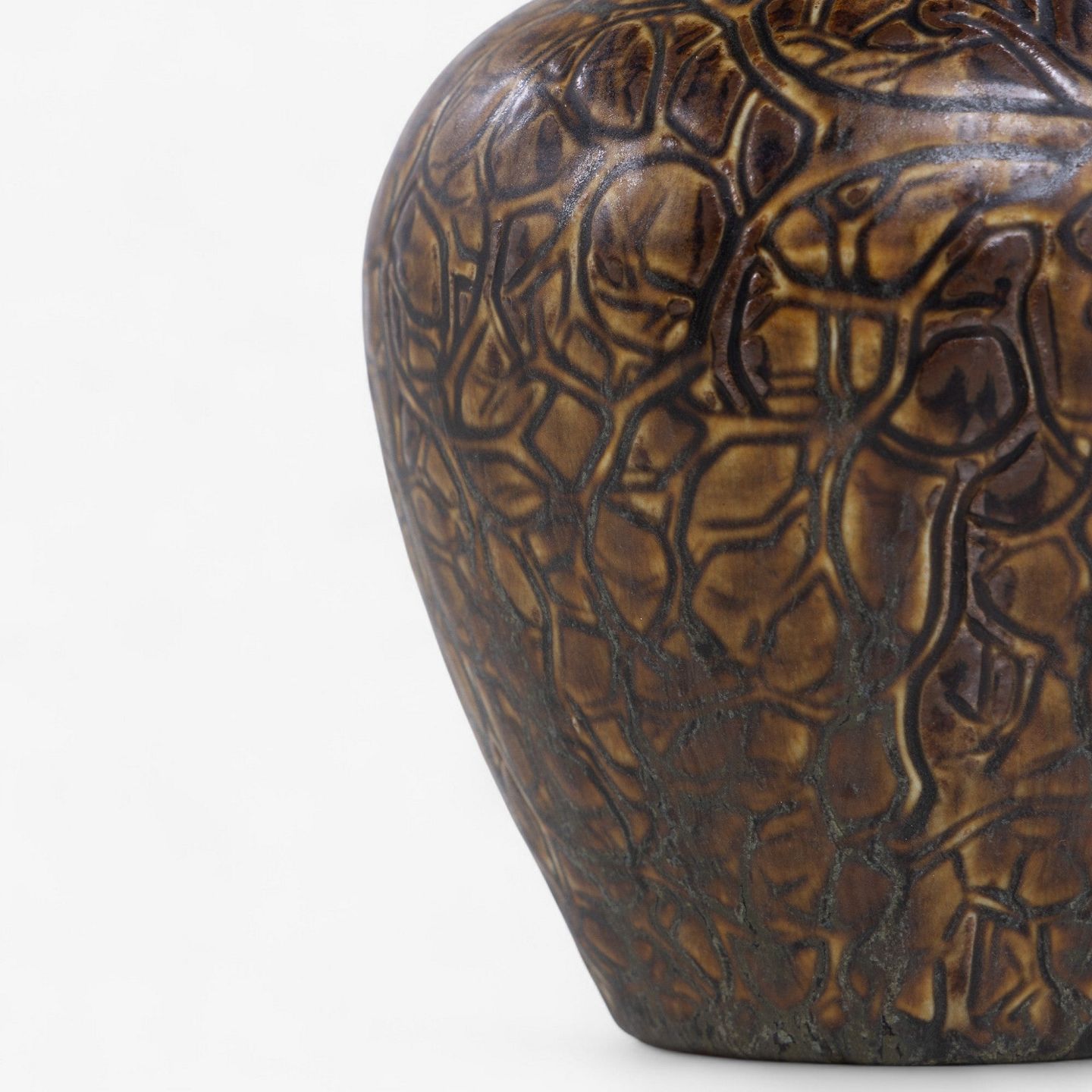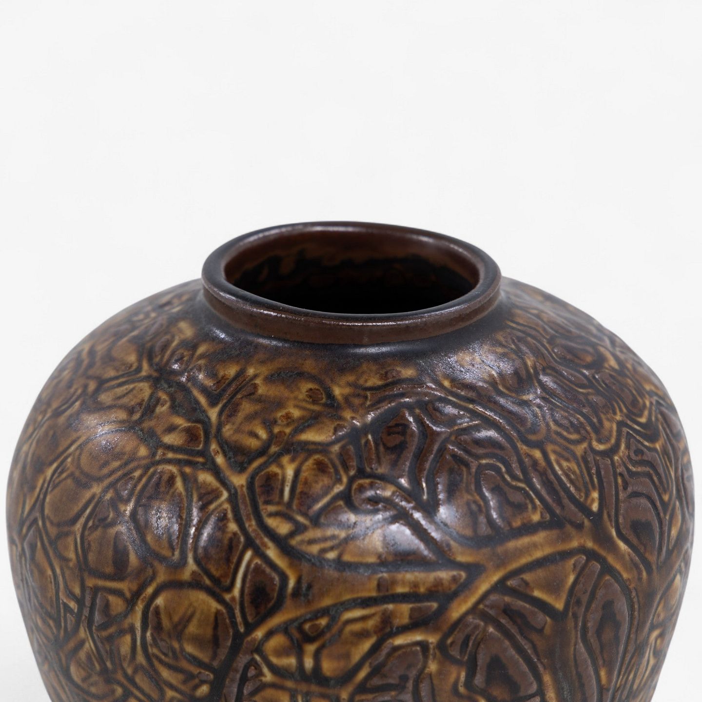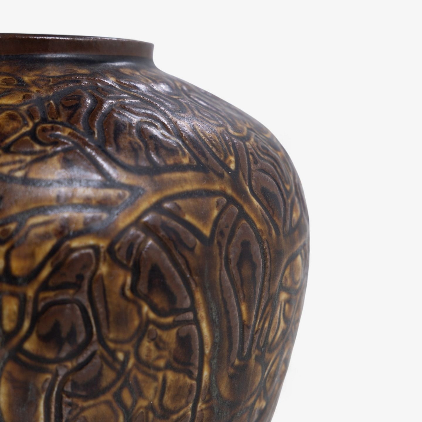 Vase i stentøj dekoreret med bladværk og brunlig glasur. Signeret.
